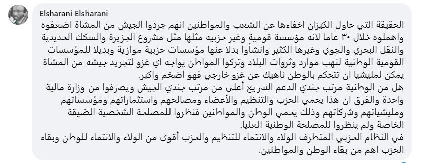 وكتار من الان بيتباكوا على الجيش (الحزبي) كانوا ساكتين و مشجعين للتدمير التم للمؤسسه دى طوال 30 سنه و ما شايفين فى مشكله..