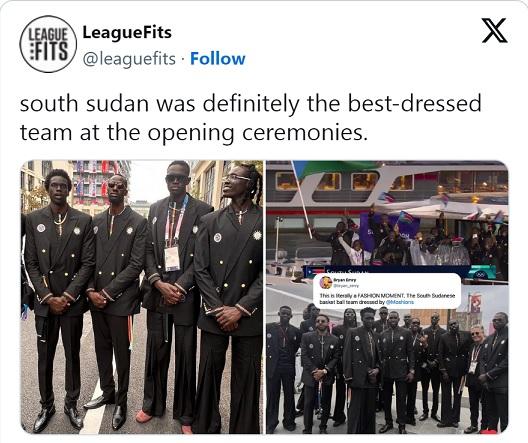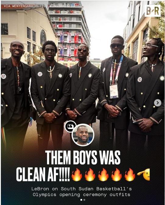 أسطورة السلة ليبرون جيمس عبر عن إنبهاره من أزياء منتخب جنوب السودان في الألعاب الأولمبية المقامة حالياً في باريس خلال حفل افتتاح دورة الألعاب الأولمبية في باريس، ارتدى الرياضيون الأمريكيون بدلات مصممة من قبل ماركة الأزياء الأسطورية رالف لورين. تعليقه على الزي الرياضي المميز لمنتخب جنوب السودان يدل على أنه كان يفضل ارتدائه دار الأزياء الرواندية الشهيرة Moshions هي من قامت بتصميم الزي الرياضي لمنتخب جنوب السودان