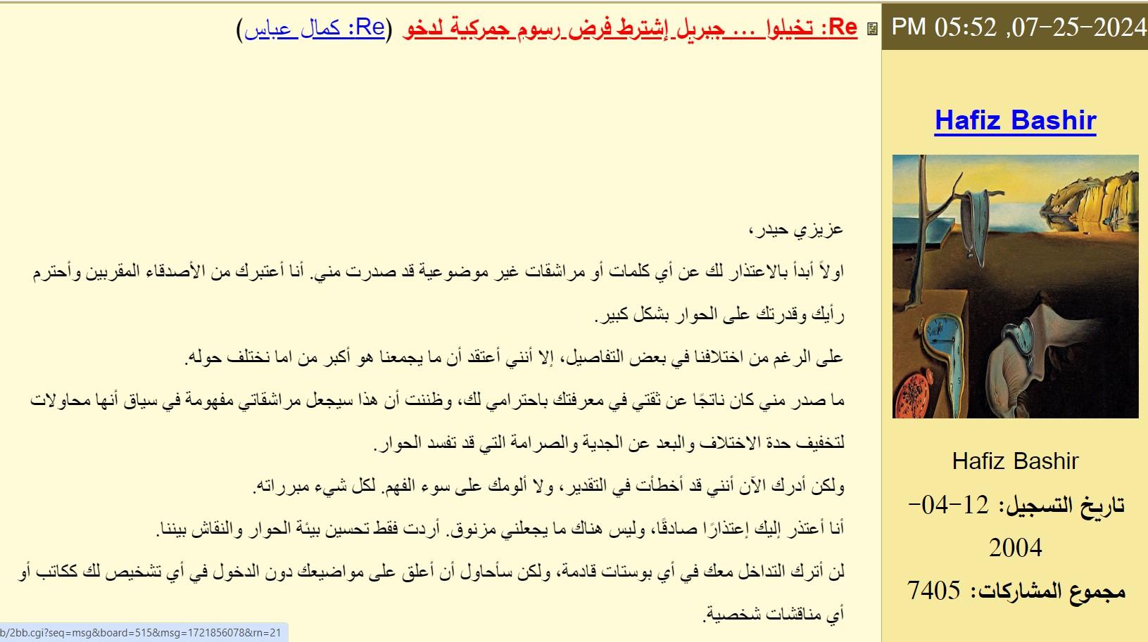 حيدر يا أخوي أنا ما متشاكل معاك، ولا في شي شخصي بيني وبينك. أنا اتابع ما يكتب في المنبر بقدر ما أقدر وأقرأ بوستاتك ومداخلاتك كما أقرأ للآخرين. أنا ما مقاطعك وطبيعي أقرأ بوستاتك إذا صادفتني وأثار إهتمامي موضوعها.