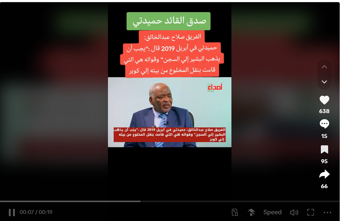 صحيح أن حميدتي شخصية مؤثرة في المجلس العسكري وله كلمته التي ينقاد إليها بقية المجلس ولكن ليس بالطريقة التي يعكسها الفيديو المزور. من المهم جداً أن نستمع لما يدلي به اعضاء المجلس العسكري بدقة وذلك يساعد في القراءة التاريخية لتلك الفترة.