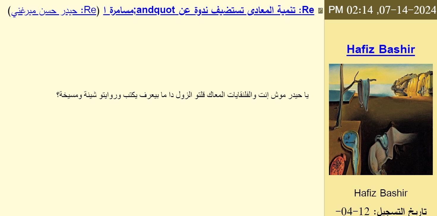 ؟ أيوا يا حيدر بالواضح أنا البوست دا فتحتو رد على بوستك الموجود رابطه فوق وجبت الرابط لتوضيح ذلك. وأرجو أن تفهم أن الرد على بوستك وليس عليك. الأمر ما فيهو أي جانب شخصي تجاهك.