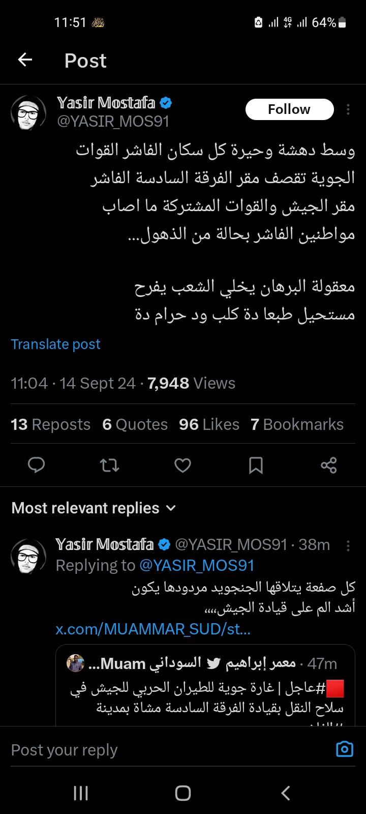 انا اعترف أضخم انتصار حققته مليشيا المؤتمر الوطني هي تحويل الصراع الي غرابة ضد غرابة الان والفاشرخير دليل،، والاقسي من كل ذلك أن مناوي الهبنقة بلع الطعم تماما. هل يعقل يا بتوع المشتركة طيط تقبلوا بان تكونو جزء من العوبة ٥٦؟ موسي هلال فعل فيكم وفي نساءكم وبناتكم ما يجعل الصخر يزرف الدم بدل الدموع..قبل ٢٥ سنة وفي ظل هذا الجيش نفسه،، تجو انتوا تقبلوا بان يكون معكم وهو ما معكم في خندق واحد بعد ما قبض أكثر من ١٠ مليون دولار قبل ٥ اشهر عشان يفتت الدعامة؟ والان ذات جماعة موسي هلال في خندق واحد مع الدعم السريع ضدكم؟ وبقبضوا مرتبات من البرهان؟ انتو يا كافي بلا يا مشتركة مافيكم زول رشيد نهايء؟؟
