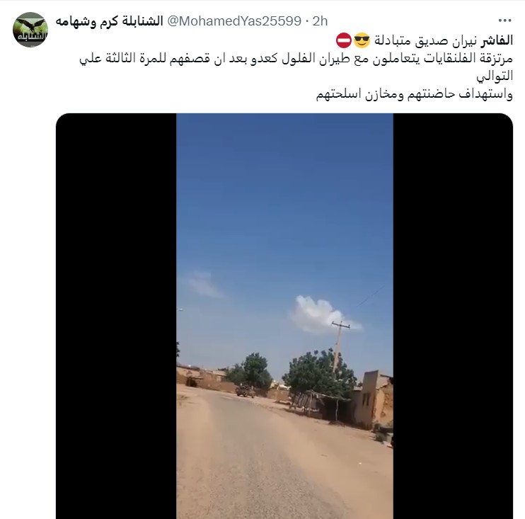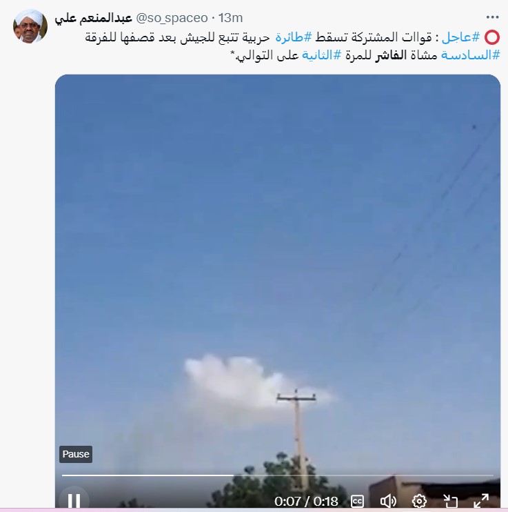 شاهدت فيديو لاشخاص يقولون انهم يتبعون للمجلس الانتقالي بقيادة منو كدا عبدالجبار التابعين الجيش تحرير السودان يطلقون النار في السماء في الوقت الذي نشرت عدة حسابات مختلفة تفيد بان جماعة مناوي قاموا باسقاط طائرة برهانية حاولت قصف الفرقة السادسة مشاة مرة اخري صباح اليوم الاثنين