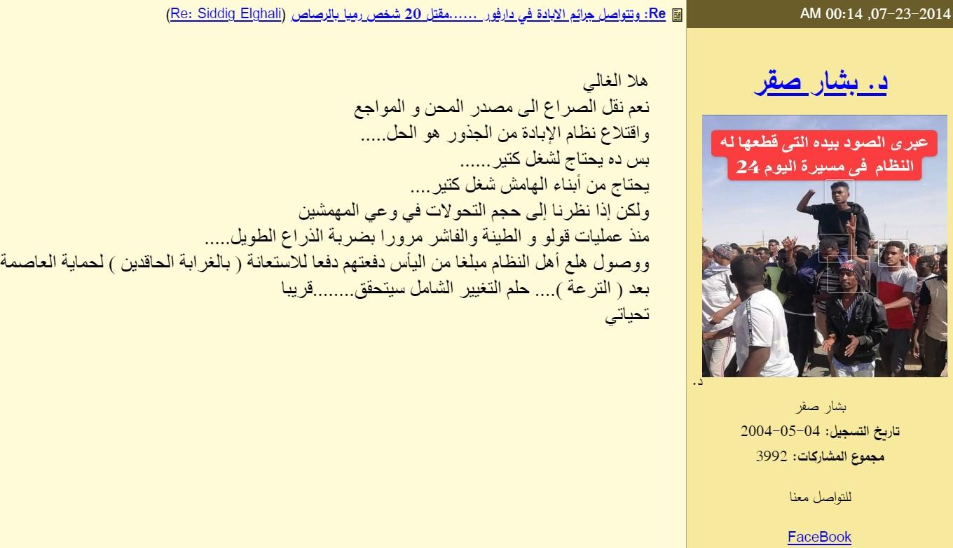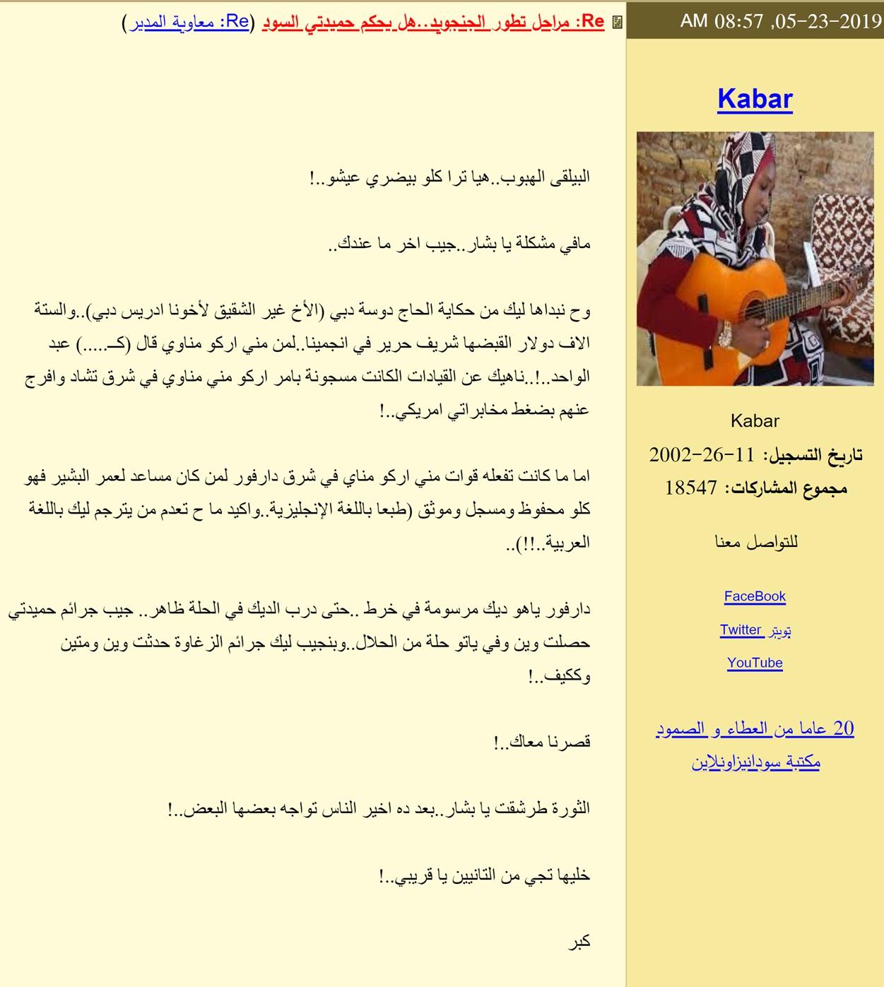 تارة تلعن العسكر ثم تحبو نحوهم وتلعق مؤخرة العسكر، تارة تلعن الجنجا وعندما قلنا لك ان موسي هلال اصبح راس حربة للعسكر وهو نفس موسي هلال الذي اغتصب حريمكم وقتل اطفالكم لا تضعوا يديكم في ايديه؟ رفضت يا ك.ل.ب ال.س.رة يا خس.يس ان تعلق.