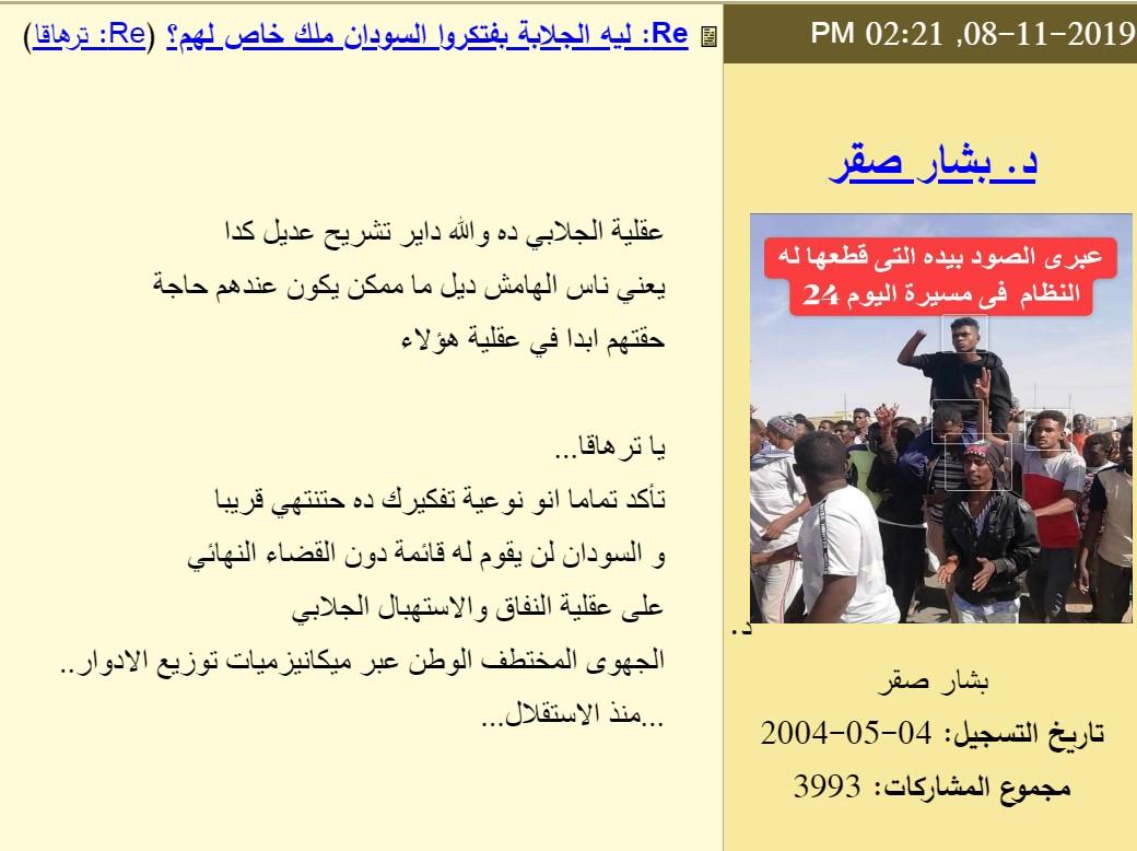 الدقم الذي منذ ان بدات الحرب يطالب بتحقيق شفاف يطال كل الاطراف المتصارعة؟ ام انت الذي حار بك الدليل؟ تارة تلهث مثل الحلوف الجيعان نحو الجلابة فيبصقون في وجهك فتشتمهم وتصف رجال الجزيرة بانهم ديوثيين حيث الجنجويدي يترك سلاح عند الباب ويدخل كي يغتصب؟https://sudaneseonline.com/board/515/msg/1726032108.html.
