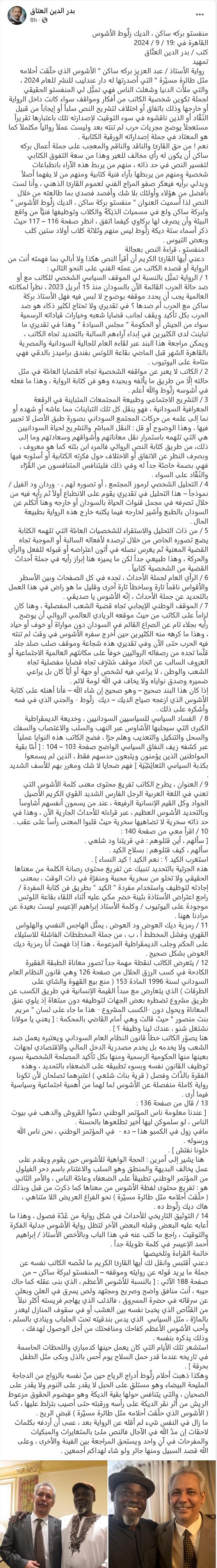 الخال المهندس، و الناقد الأدبي الأكثر بريقا في السودان: بدر الدين العتاق: كل الحب و التقدير. عودا حميدا. نحمد الله لحل مشكلة الباسويرد. البورد يحتاجك لأن فضاءآتك الكتابية مختلفة، محفزة للفكر، أكثر عمقا، و تصنف الأفضل ديباجة من ناحية اللغة. و أنا أقترح عليك مراسلة أيا من الزملاء الأفاضل الآتية أسماءهم: 1 - Yasir A Elsharif ( الدكتور طبيب ياسر الشريف، و هو من مواطني الأبيض و يعرف صهرك ، زوج بنت عمك، المرحوم صديق محمدخير. 2 - المهندس: حيدر حسن ميرغني 3 -مولانا: Hafiz Bashir ليشرحوا كيفية رفع الفيديوهات، الصور، والموضوعات التي تنشرها على التواصل الإجتماعية، رفعها لمنبر سودانيز اونلاين للنقاش حتي يطلع قراء المنبر على نشاطك الثقافي و الإعلامي الثر في المنابر الثقافية بدولة مصر الشقيقة مصر، و كءلك مؤلفاتك العديدة في مختلف ضروب المعرفة. الأستاذ بدر الدين العتاق يعتبر الاديب و الكاتب السوداني الأبرز و الأوسع نشاطا في الأوساط الثقافية المصرسودانية بقاهرة المعوز، و قد نال على جوائز تقديرية عديدة مكافأة له على نشاطاتة الثرة في الأروقة الثقافية بدولة مصر الشقيقة.