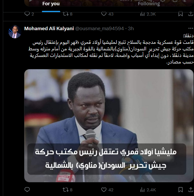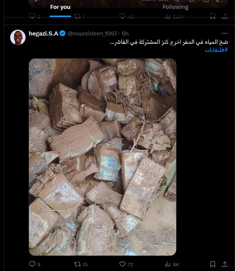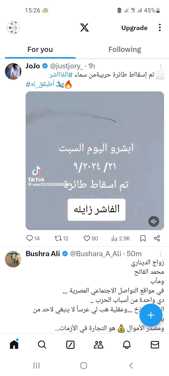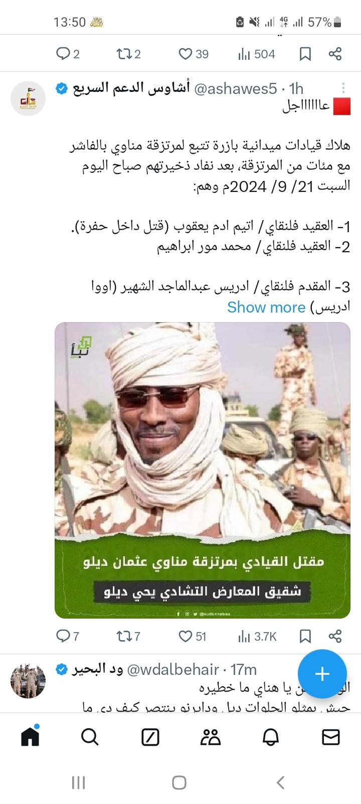 والله يا خدر بقيت اكره منصة اكس، ياخي اكون مطنش المنصة ٤ ساعات وافتح التايم لاين يلاقوني جثث ضباط بحري، جثث عيال السقاي، استسلام عشرة ضباط مشتركة،،، يا زول ما بنزل فيديوهات بديك اللينكات وانتم امشوا فتشو وابكوا 😉. لينك اقتلاع الدعامة للمشتركة من داخل دشم المشتركة. ١-https://x.com/wasilalitaha/status/1837516599667970485؟t=795J-rUwOKuWMWzHixDcnwands=19https://x.com/wasilalitaha/status/1837516599667970485؟t=795J-rUwOKuWMWzHixDcnwands=19 2- لينك فيديو اسقاط الطايرة بالفاشر. https://x.com/justjory_/status/1837482860967612882؟t=Adc6EuBW5x7jHrv1lqqmOwands=19https://x.com/justjory_/status/1837482860967612882؟t=Adc6EuBW5x7jHrv1lqqmOwands=19 3-لينك فيديو الحفر التي حفرتها المشتركة ودفنوهم فيها. https://x.com/justjory_/status/1837417786940805319؟t=eS1txuZ3uJ60qzyAe-lffAands=09https://x.com/justjory_/status/1837417786940805319؟t=eS1txuZ3uJ60qzyAe-lffAands=09