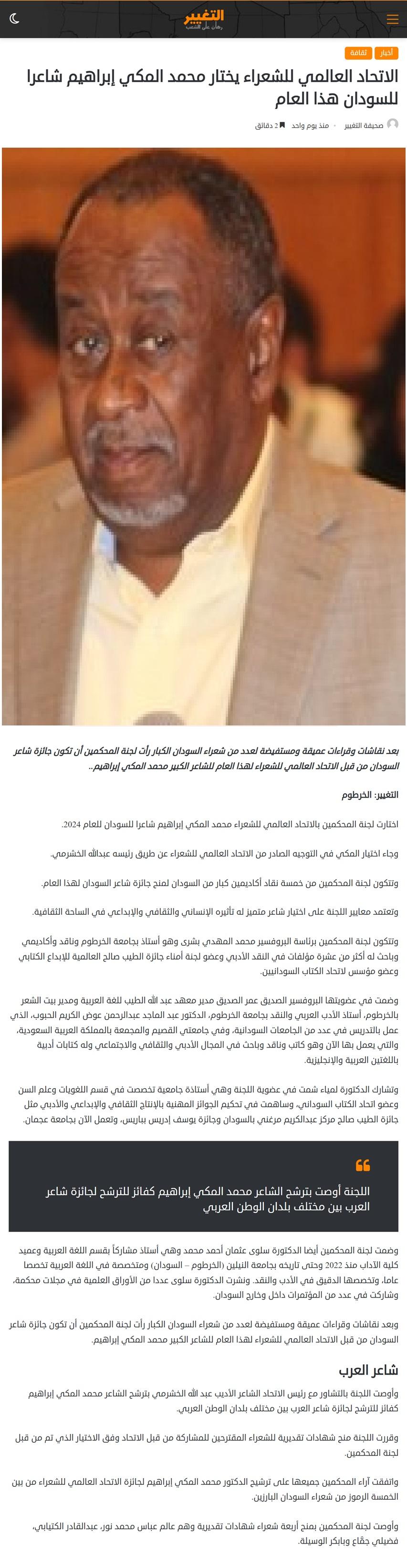 أخي حيدر لك كل الشكر والامتنان علي أيرد هذا الخبر ,إنه حقًا خبر مفرح! اختيار الشاعر الكبير محمد المكي إبراهيم لجائزة شاعر السودان لعام 2024 هو تكريم مستحق لشاعر له تأثير عميق في الساحة الثقافية السودانية. أتمنى له الشفاء العاجل، وأن يستمر في إلهام الكثيرين بأشعاره.