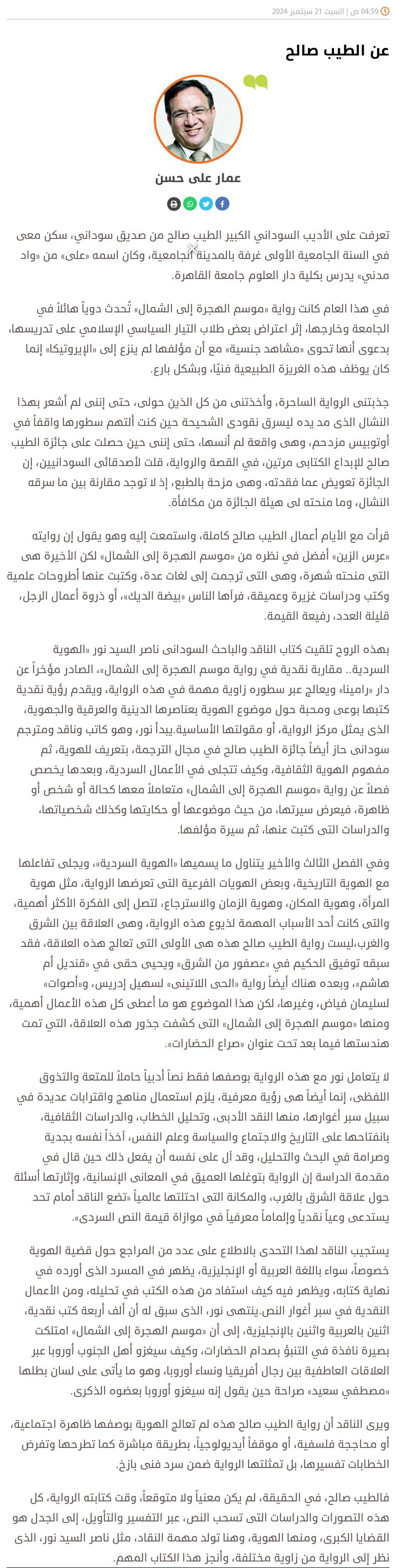 " لا أفهم معنى للموت.. لكن ما دام محتماً فلنفعل شيئاً يُبرّر حياتنا. فلنترك بصمة على هذه الأرض قبل أن نغادرها " بطل رواية “واحة الغروب” للكاتب الراحل بهاء طاهر - يا لها من بصمة تلك التي تركها أديبنا الراحل الطيب صالح .. يسهر من يسهر حولها ولا يختصم. " يُقرأ المبدع الكبير مرتين ، الأولى في حياته وزمنه ، وأخرى للتأمل والتنقيب عن زوايا أخرى في إبداعه بعد الرحيل. لأن القراءة التالية هي البحث فيما وراء الكلمات والسطور وبطريقة مغايرة للقراءة الأولى" كم من البحوث والقراءات غير المتشابهات قُدمت حول إبداعه هنيئاً للمكتبة بهذا البحث الجديد