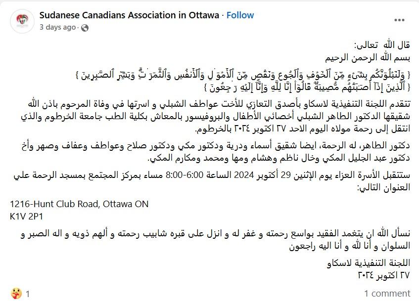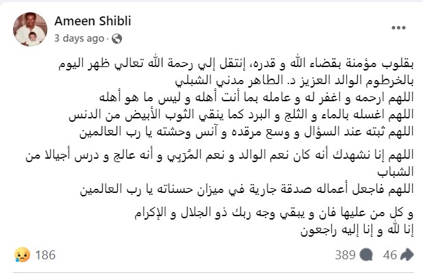 Ameen Shibli 1 Tag [قبل يوم] السلام عليكم و رحمة الله و بركاته نشكر كل من تواصل معانا و هاتفنا معزياً في فقدنا الجلل خلال الأيام الماضية جزاكم الله عنا كل خير و شكر سعيكم في ناس كتيرة إتواصلت معاي بي خصوص إشاعة أنه الوالد كان معتقل من قبل الدعم السريع و ده كان سبب مباشر في الوفاة ده كلام أبداً ما صحيح. الوالد كان مريض في آخر أيامه بالملاريا و كان راقد في مستشفي الرازي إلي أن اصطفاه الله إلي جانبه إتذكروه دائما في دعواتكم و ربنا يتغمده بواسع رحمته و جميع موتانا و موتي المسلمين و يحسن إليهم إلي يوم الدين |