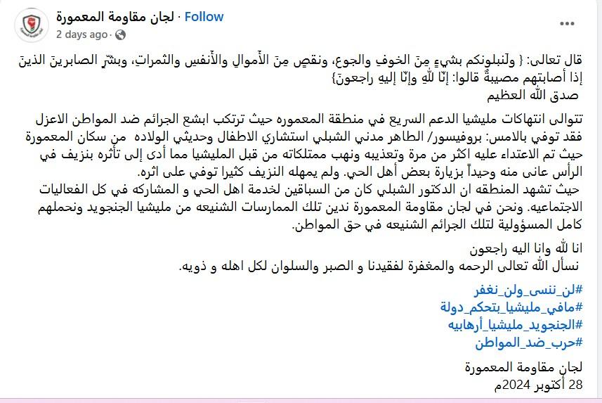 Quote: مليشيا الدعم السريع تغتال بروفيسور الطاهر الشبلي الأثنين 25 ربيع الثاني 1446هـ 28-10-2024م في الأخبار, الولايات وقت القراءة المقدر:1 mins read 0 A A اغتالت مليشيا الدعم السريع المتمردة ، استشاري طب الأطفال، البروفيسور “الطاهر مدني الشبلي”، بعد اختطافه من منزله في حي المعمورة بولاية الخرطوم.