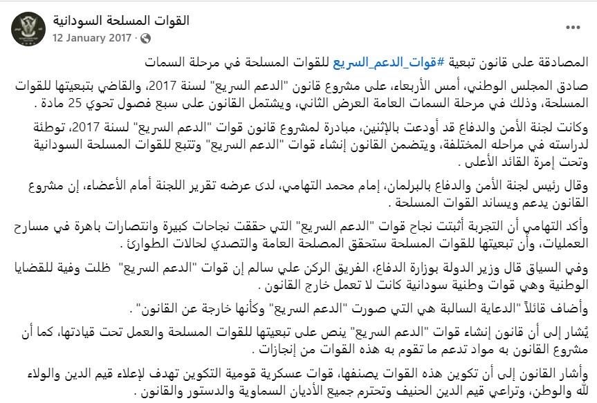 ◼️ واعتبر تبعية قوات الدع.م الس.ريع للجيش تساعد في التحرُّك السريع للقيام بأي أمر ذلك لأن الجيش حركته تحتاج لوقت والدع.م الس.ريع تتحرَّك في أي وقت ويملك فردها زاداً لـ(72) ساعة يحملونه معهم.