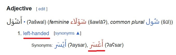 الأَيْسَرُ الأَيْسَرُ : أَفعل تفضيل من يَسُرَ (بتثليث السين) . يقال: هو أَيسرُ منه. و الأَيْسَرُ خِلافُ الأَيمن. يقال: هو في الجانب الأَيسر. و الأَيْسَرُ الذي يَعمل بيده اليُسرى. يقال: هو أَعْسَرُ أَيْسَرُ. والجمع : يُسْرٌ.