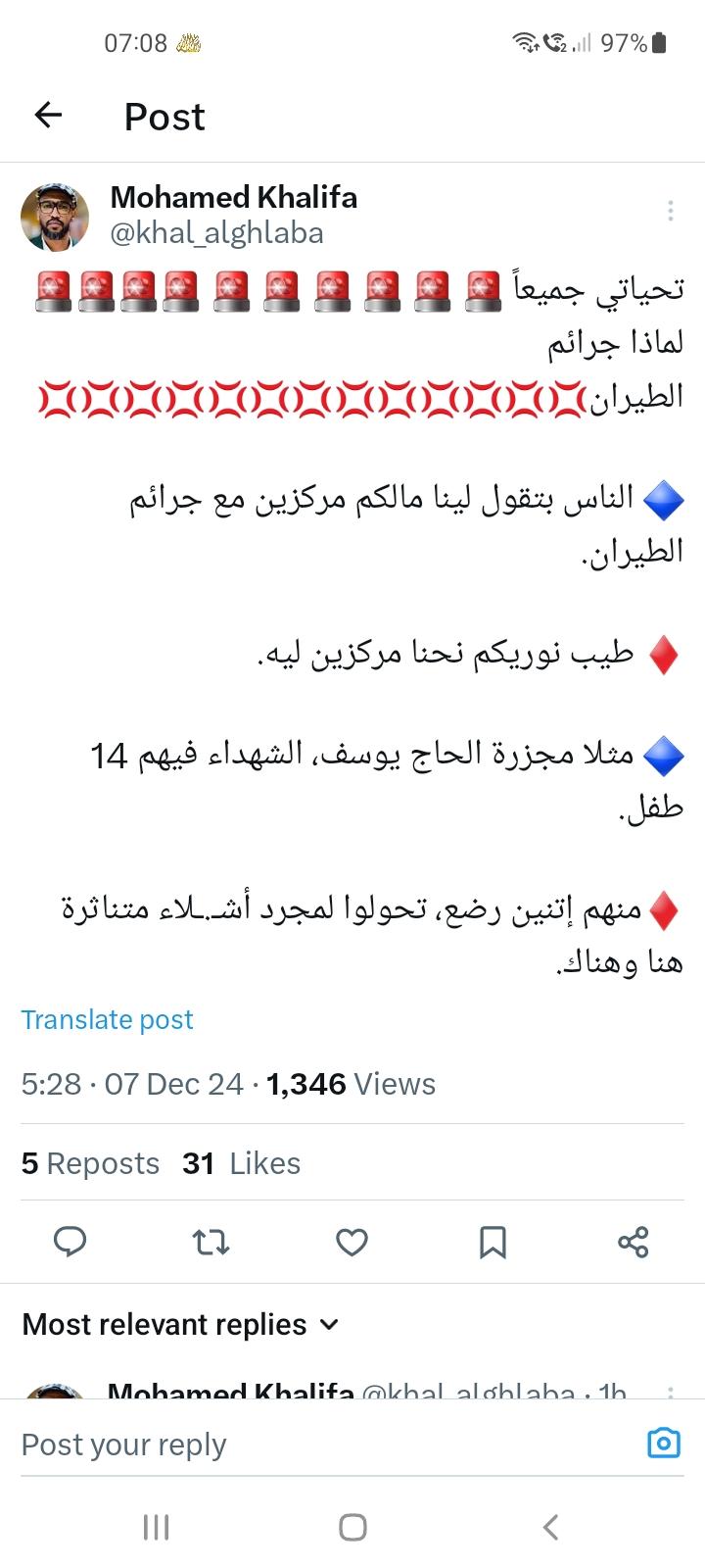 Quote: أنقذوا السودان Save Sudan 🇸🇩 @blackboy · 13h رحم الله شهداء مسجد الإجابة (مسجد شيخ أحمد) بمدينة بحرى فى شمبات، و الذين صعدت أرواحهم لبارئها، حسب ما أكده أهالى شمبات أن ماحدث كان نتيجة قصف جوي للجيش عند صلاة الجمعة اليوم. حسبنا الله و نعم الوكيل و لاحول و لاقوة الإ بالله.