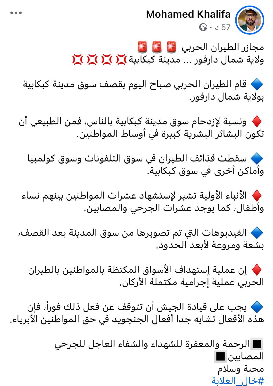 دي أخطاء مؤكد غير متعمدة ومتاجرة ناشطي الجنجويد بهذه الأخطاء طبيعي ونطالب القوات المسلحة بتوخي الحذر في ضربات الطيران وتجنب اصابة المدنيين الذين يستخدمهم الجنجويد دروع بشرية وصحابنا الدقم عامل احتفال بالموضوع دا مع أنو جماعتو نفذوا مذابح في الجنينة والجزيرة وبيكتلوا المدنيين على الهوية والبرحموهو بنهبوهو ويطردوهو من بيتو