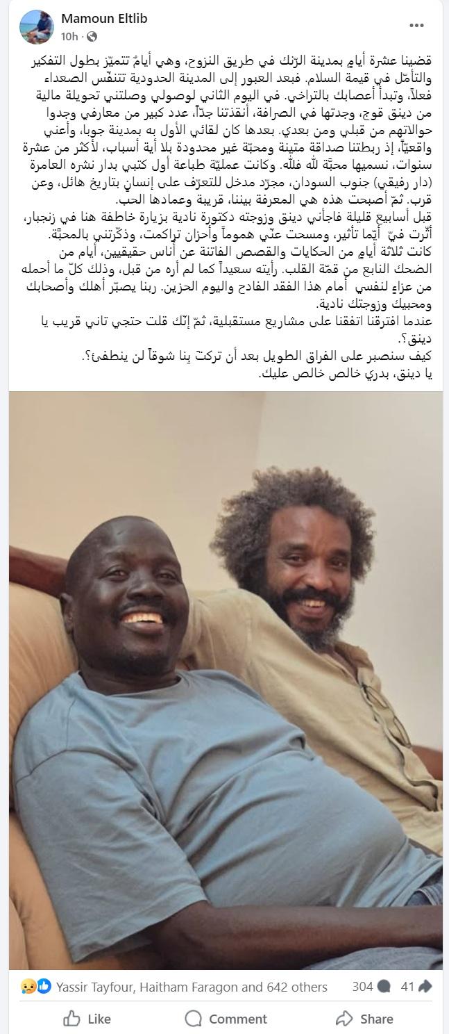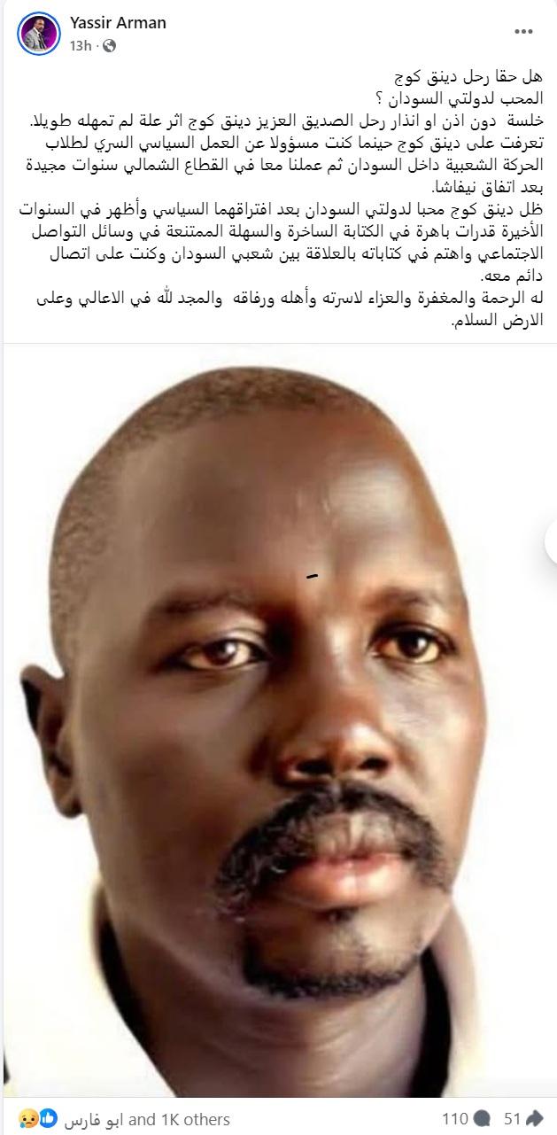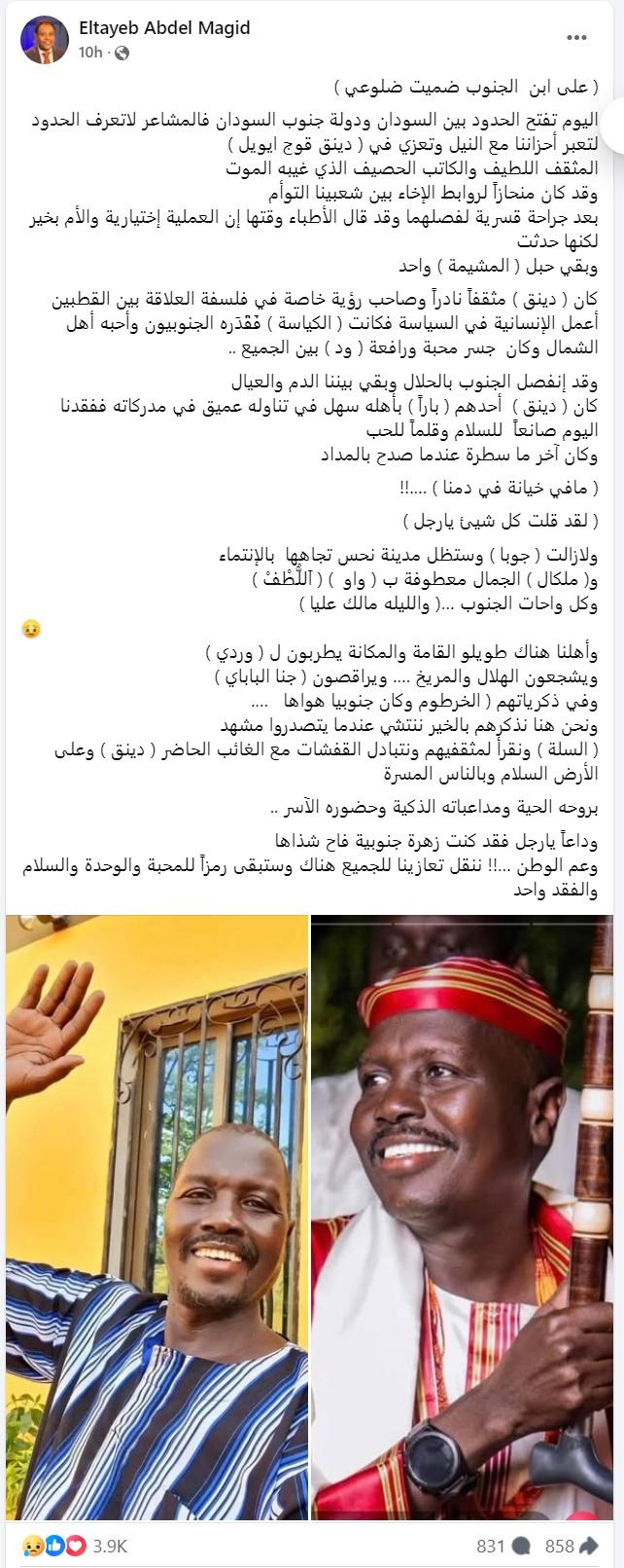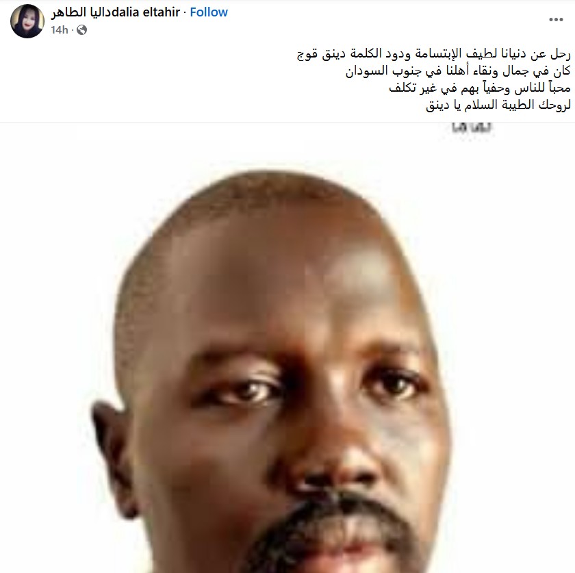رحيل محزن وأليم لا نقول إلا ما يرضي الله اسأله أن يتغمده بواسع رحمته ويتقبله قبولاً حسناً دينق صديق عزيز وزميل دراسة في الجامعة في مصر سيفتقده احبائه الكُثر في حسابه العامر بالمحبين في الفيس بوك حيث امطروا روحه السمحة بالنعي الأليم وبالدعاء سيفتقده اصدقائه المداومين على التفاعل مع ما كان يكتبه زهير الزناتي وصلاح الامين وتيسير عووضة وطارق جبريل وعلاء تمبس وغيرهم من ابناء وبنات الوطن الكبير وداعاً صديقنا العزيز ارقد بسلام