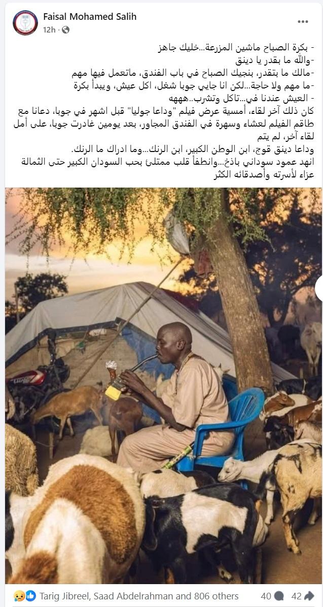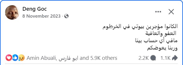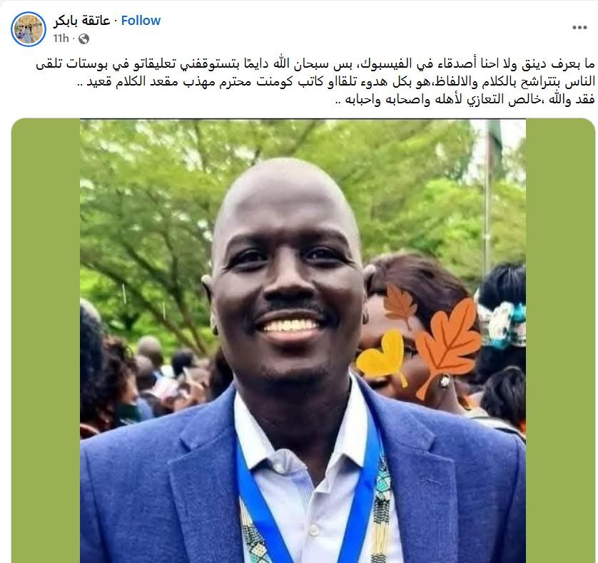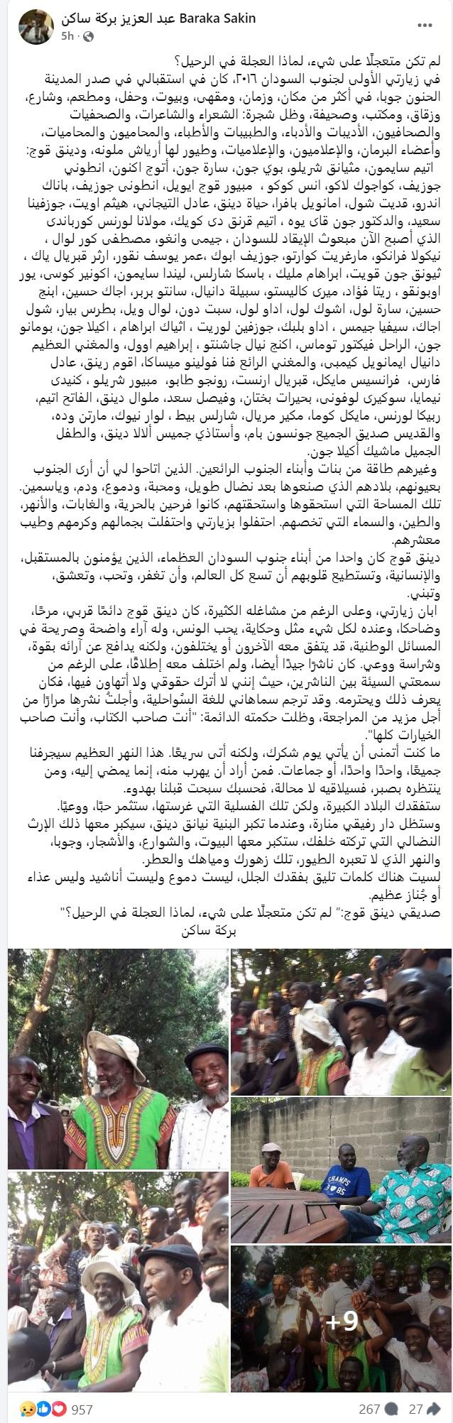 رحيل محزن وأليم لا نقول إلا ما يرضي الله اسأله أن يتغمده بواسع رحمته ويتقبله قبولاً حسناً دينق صديق عزيز وزميل دراسة في الجامعة في مصر سيفتقده احبائه الكُثر في حسابه العامر بالمحبين في الفيس بوك حيث امطروا روحه السمحة بالنعي الأليم وبالدعاء سيفتقده اصدقائه المداومين على التفاعل مع ما كان يكتبه زهير الزناتي وصلاح الامين وتيسير عووضة وطارق جبريل وعلاء تمبس وغيرهم من ابناء وبنات الوطن الكبير وداعاً صديقنا العزيز ارقد بسلام