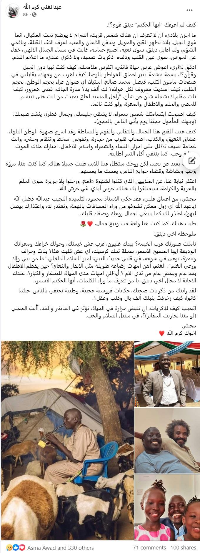 شكرا حيدر على هذا الاقتباس لمرثية عبد العزيز بركة ساكن لصديقه المرحوم دينق ... وهي مرثية تفوح منها الادب الرصين ... وندعو مرة أخرى ان يكون مسكنه الجنة ... ونردد هذه الفقرة التي اسرتنا بسطورها القوية وشكرا لك بركة ساكن ؛؛:: : " ما كنت اتمنى ان ياتي يوم شكرك ولكنه أتى سريعا ،وهذا النهر العظيم سيجرفنا جميعا واحدا واحدا او جماعات ،فمن أراد أن يهرب منه انما يمضي اليه ومن ينتظره بصبر فسيلاقيه لا محالة..فحسبك سبحت قبلنا بهدوء. صديقي دينق لم تكن متعجلا على شئ ،فلماذا العجلة في الرحيل .""؛
