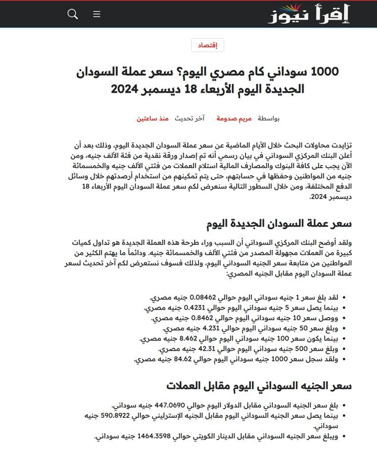 1000 سوداني كام مصري اليوم الأربعاء 18 ديسمبر 2024؟