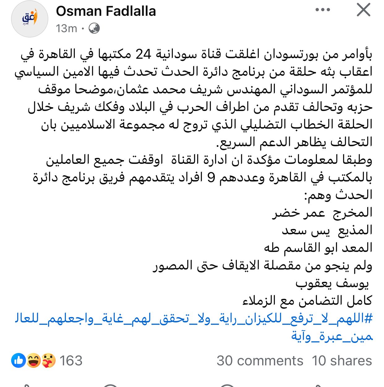 ♦️ البودِّيكم تجيبوا شريف محمد عثمان شنو ؟ ♦️ البودِّيكم تجيبوا زول من القحاته في واحدة من القنوات السودانية شنو ؟ ♦️ نحنا عشان مقبلاتهم في القنوات الخارجية عاوزين نقبضهم ونختهم في السجن تجوا انتوا تجيبوهم لينا عديل في القناة والسودان كلو يسمع فيهم ؟ ♦️ نحنا لينا 20 شهر مانعين زول من تقدُّم يظهر في قنوات السودان .. مانعنهم من التواجد في السودان وسط الجماهير .. مانعنهم من من ابداء الراي .. بنطارد فيهم بأداة عدالتنا الخاصة ( النائب العام ) عشان نختهم داخل السجون ونحظر صوتهم من الظهور .. انتوا تجوا تجيبوهم في سودانية 24 ؟ ♦️ تجيبوا شريف عشان يخلِّي ضيفنا البلبوسي قاعد زي الطرطور ؟ ♦️ تضيِّعوا مجهود غرفنا الإعلامية ؟ ♦️ تضيِّعوا ملايين الدولارات في دقائق معدودة ؟ ♦️ تنسفوا عمل آلاف الحسابات المزيّفة والأسماء المستعارة ؟ ♦️ يعني فلاحة منكم ؟ ♦️ ما نحنا عارفين القحاتي لو لقى فرصة زي دي حا يمسح بينا الواطة .. ♦️ هسه نعمل فيكم شنو ؟ ♦️ لو حاكمناكم كطاقم كُلّكم ومسحنا نشاطكم من القناة كيف نقدر نمسح انتشار المقابلة ؟ ♦️ رميتونا في ورطة من الصعب جداً تتعالج تاني ..