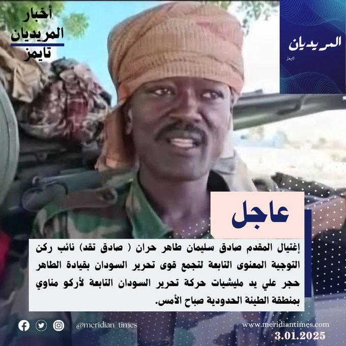 اعلن تجمع قوي تحرير السودان بقيادة الطاهر حجر في بيان رسمي صدر الجمعة وفاة القائد الميداني الصادق سليمان الطاهر، الذي شغل منصب نائب ركن التوجيه المعنوي بالتجمع، “بعد أن تعرض للقتل يوم الخميس في حادثة غدر وخيانة” وفق البيان.