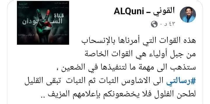 القوني يبرر لهروب الجنجا من الخرطوم ايذانا بتحريرها الكامل القادة هربوا زمان ومابقي الا الرعاع الذين ينتظرون مصيرهم المحتوم .. طبيز جهز مبرراتك من اسه، بس ما تقول الاشاوذ انسحبوا من جبل اولياء عشان يصلوا التراويح في الضعين