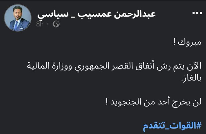 Quote: Yousif .I. Izzat @yousifizz تم التأكيد الآن، ومن جهات فنية معتمدة، أن ميليشيات الحركة الإسلامية التي دخلت القصر الجمهوري اليوم قد استخدمت أسلحة وغازات محرمة دوليًا.