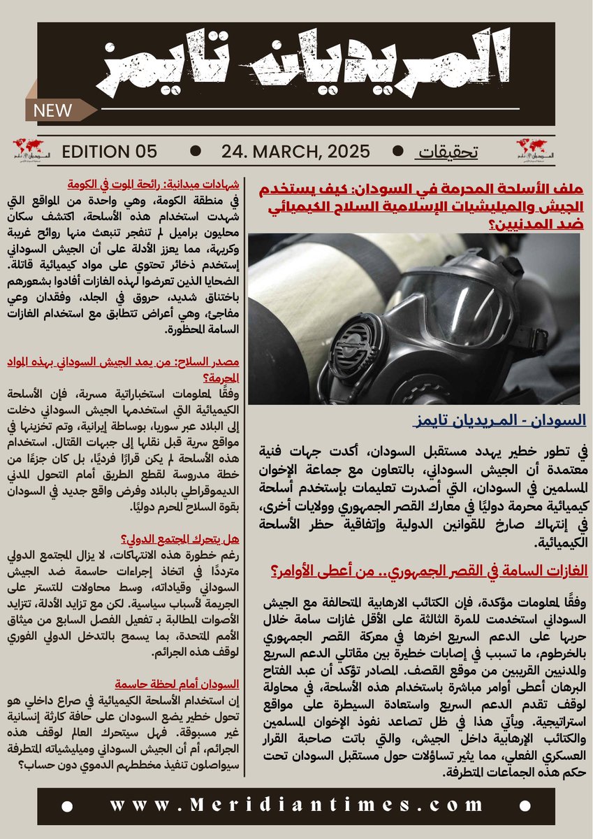 *السودان أمام لحظة حاسمة* إن استخدام الأسلحة الكيميائية في صراع داخلي هو تحول خطير يضع السودان على حافة كارثة إنسانية غير مسبوقة. فهل سيتحرك العالم لوقف هذه الجرائم، أم أن الجيش السوداني وميليشياته المتطرفة سيواصلون تنفيذ مخططهم الدموي دون حساب؟