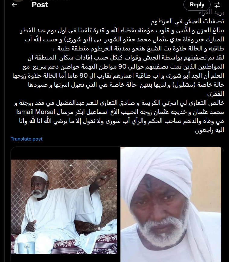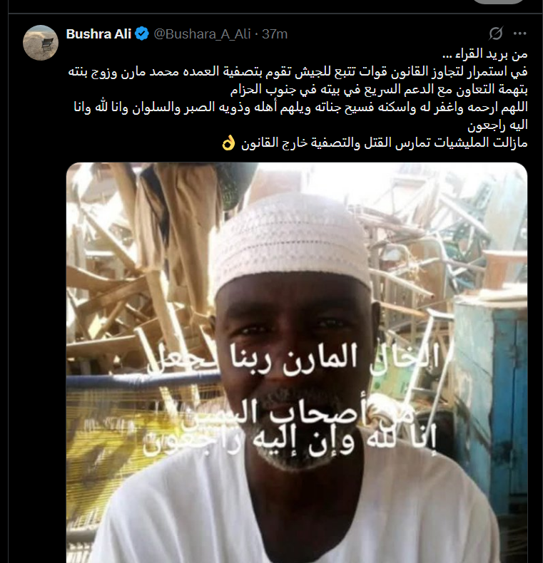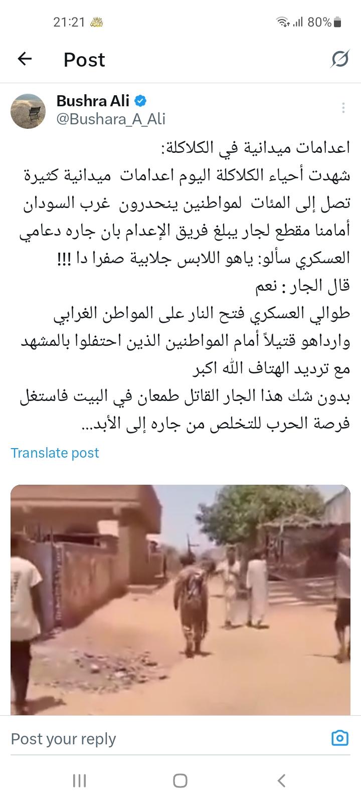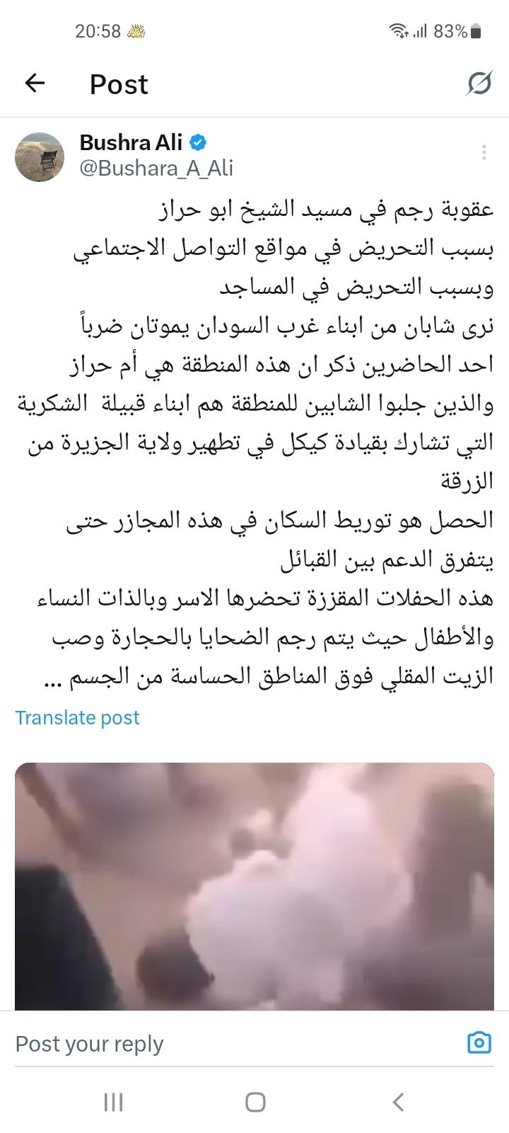 Quote: Bushra Ali @Bushara_A_Ali · 12h من بريد القراء ((السلام عليكم اتمنى توصلوا رسالة بمنصاتكم لأهلنا في غرب السودان جميع القبائل الان أولادهم و نسائهم صغيرهم وكبيرهم الساكنين امبدة من المواطنين العزل من الحارة ١٧ و١٤ و١٥ و١٦ و٢٠ و٢١ ودارالسلام و الفتيحاب جمعتهم المليشيات الإرهابية في حي المهندسين امدرمان في مدارس وبيوت وكل يوم بيضبحوا منهم ذي ٧٠ الي ٨٠ نسوان ورجال وشباب وبختوهم في الشمس الي الان لم تدفن الجثامين ويتم الذبح من الاضان للاضان وقدام أهلهم واولادهم وبعدا مادخلوا زول يقرب من الجثث الي الان لم تدفن وعندهم مقابر جماعية عملوها داخل اشلاق المهندسين دي دفنو فيها ميات من المواطنين ديل بجيبوهم مقتلوين......