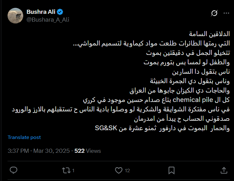 Quote: Bushra Ali @Bushara_A_Ali · Mar 30 الدلاقين السامة التي رمتها الطائرات طلعت مواد كيماوية لتسميم المواشي... تتخيلو الجمل في دقيقتين بموت والطفل لو لمسا بس بتورم بموت ناس بتقول دا السارين وناس بتقول دي الجمرة الخبيثة والحاجات دي الكيزان جابوها من العراق كل ال chemical pile بتاع صدام حسين موجود في كرري في ناس مفتكرة الشوايقة والشكرية لو وصلوا بادية الناس ح تستقبلهم بالارز والورود صدقوني الحساب ح يبدأ من امدرمان والحمار البموت في دارفور ثمنو عشرة من SGandSK