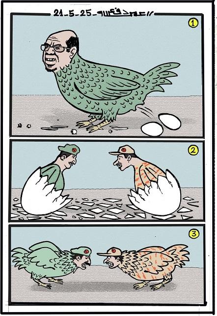 الكاريكاتير المتصدر لهذه الصفحة اختصر السكة من كتابة مجلدات عن حقيقة الوضع المزري الذي وصلنا إليه ومن كان السبب ، الكيزان وصنيعة الكيزان ، وكما المفاصلة كعاتدهم انقسم الفلول في تقسيم الكيكة إلى حميدتي والبرهان وانقسموا فيما بينهم إلى جيش ودعم سريع كليهما خنجر في خاصرة الوطن ، ويدفع الثمن المواطن الاعزل. والعامل المشترك بينهما ، إجهاض ثورة الشعب ، في دي هم متفقين تماما وما فض الاعتصام ببعيد.