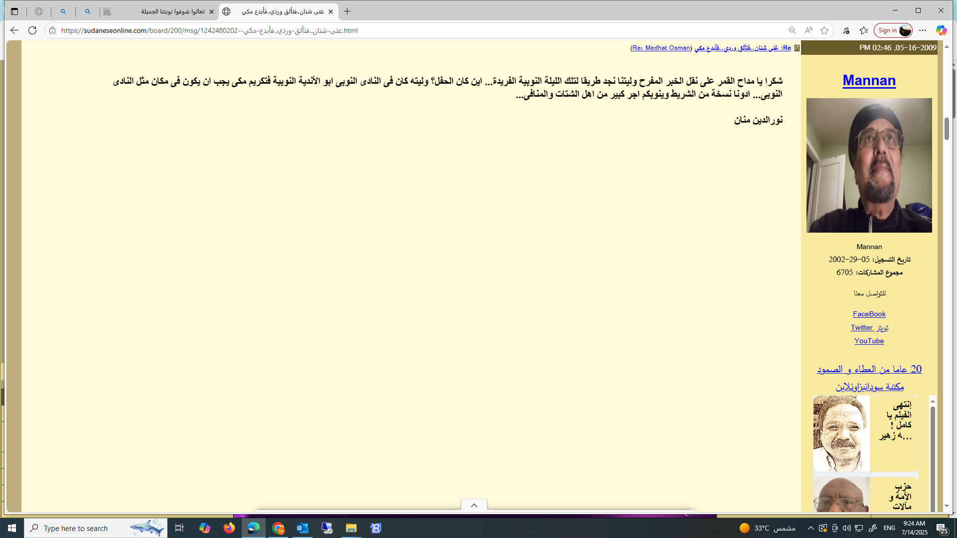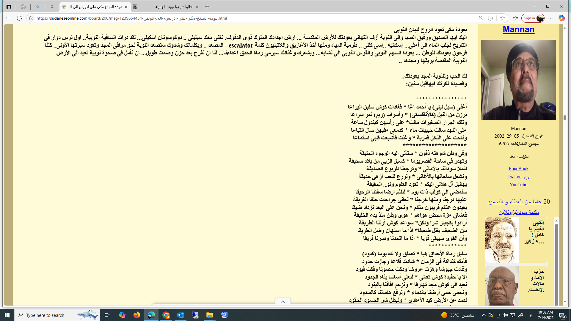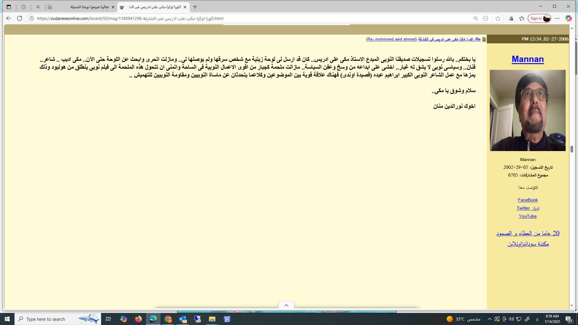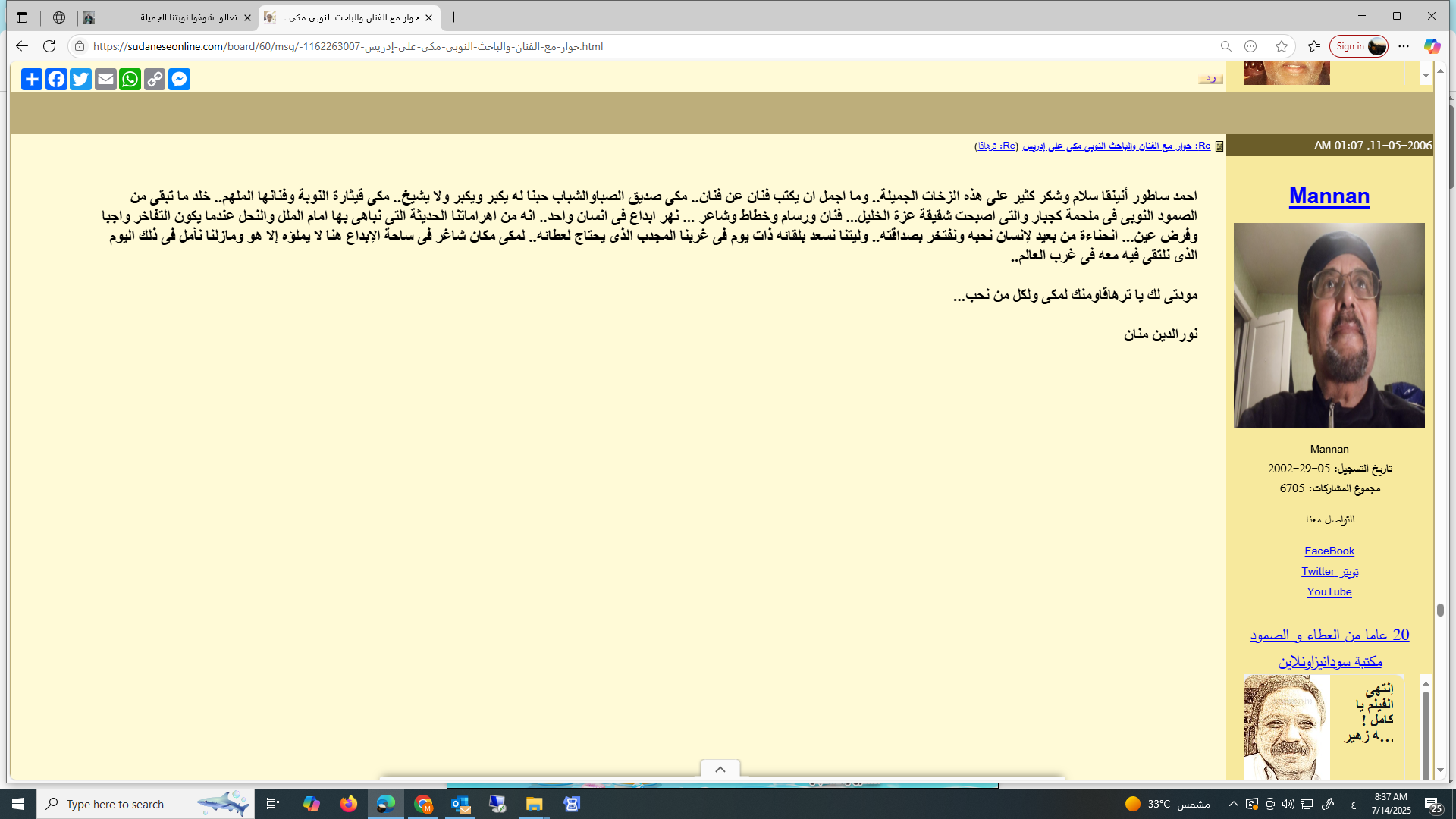 رحم الله حبيبي وحبيب الارض والإنسان مكي هكذا يمضي سريعا وهو يحكي قصة الإنسان واالتاريخ والنوبه تحكي ومضى مكي الى خالقه حاملا احزان تانهسو وكوش من بلاد عاث فيها جنجويد ووحوش وبغاة وزناة وطغاة وفلول لمكان ليس فيه جنجويد وتتار ومغول مسرعا يحمل شكواه وظلم الجنجويد لإله الناس للرب الودود نحن اصبحنا يتامى في انتظارك كانت النوبة تحيا وتشارك بانتصارك في المعارك يا حبيب الارض والإنسان مهلا برحيلك صارت النوبة سهلا ****** لا حول ولا قوة إلا بالله العلي العظيم وإنا اليه راجعون. رحل زميل الصبا والشباب وصديق الزمن الجميل وحادينا وشادينا وشاعر الملاحم النوبية ومغني أحزان كجبار ودال الدلال الاخ الحبيب مكي على ادريس الشاعر الفنان والمغني والمعلم والتشكيلي والانسان المبدع الشامل متعدد المواهب، لقد شق علينا رحيلك ونحن نعد العدة للقائك حضورا للإستشفاء بعد ان تفرقنا شذر مذر سنينا طوال منذ عبري الزمن الجميل. لقد كان غناؤك رفيقنا وسلوانا والحبل السري الذي يربطنا بالوطن وأرض رماة الحدق والكنداكات وكنا نمني أنفسنا في اغترابنا الإجباري الطويل بلقاء كبير لنحملك فوق الاكتاف ونغني لعديلة ولكجبار: (آقجنا اورقوناني..كيدافيوليناني) ونغني لإيسيب وهيلة (روميو وجولييت النوبة) ونهتف لمكي: سليل رماة الحداق هيا * تعملق ولآ تك يوما )كدود فأمك كنداكة فى الزمان * شادت قلاعا وجازت حدود وقادت جيوشا وهزت عروشا ودكت حصونا وفكت قيود