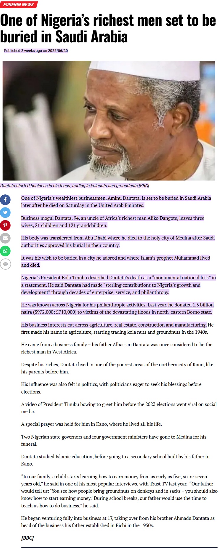 قبل ايام توفى رجل الاعمال النيجيري الثري أمينو دانتاتا في الامارات أوصى بدفن جثمانه في المدينة المنورة . وهو ما تم بالفعل بعد موافقة السلطات السعودية يعبر رمز من رموز نيجيريا ، شكل علامة فارقة في تاريخ الأعمال والخدمات الخيرية ليس على مستوى نيجيريا فحسب ، وإنما على مستوى القارة الأفريقية يرحمه الله ويحسن إليه ويتقبله قبولاً حسناً كان بحق رجل بر وإحسان كما جاء في سيرته الكاملة