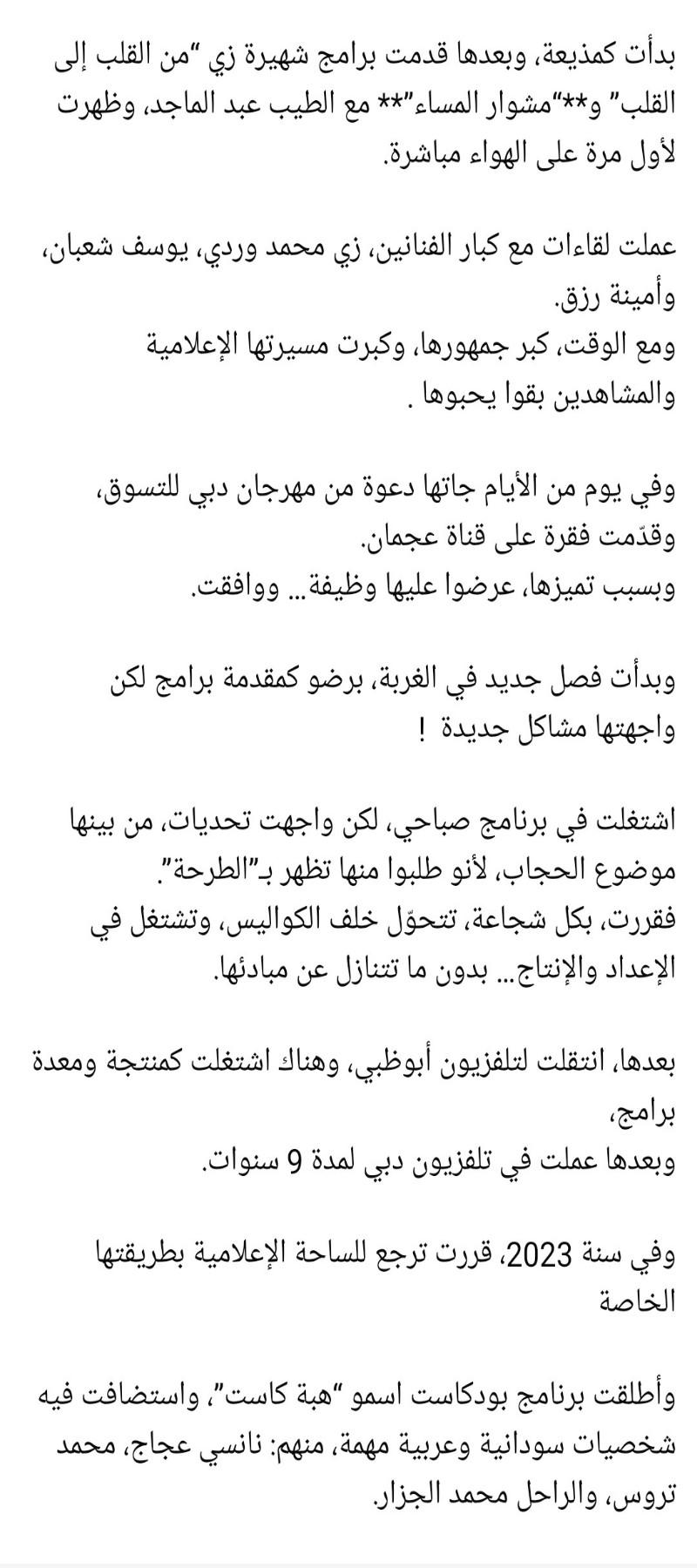 عملت في برنامج صباح الإمارات، لكنني واجهت تحديات جديدة، من بينها موضوع الحجاب. في السودان، كنت محجبة. في دبي، طلبوا مني "الطرحة". قررت الانتقال إلى خلف الكواليس، في قسم الإنتاج والإعداد، لأنني أردت أن أحتفظ بصورتي كما عرفني الناس.