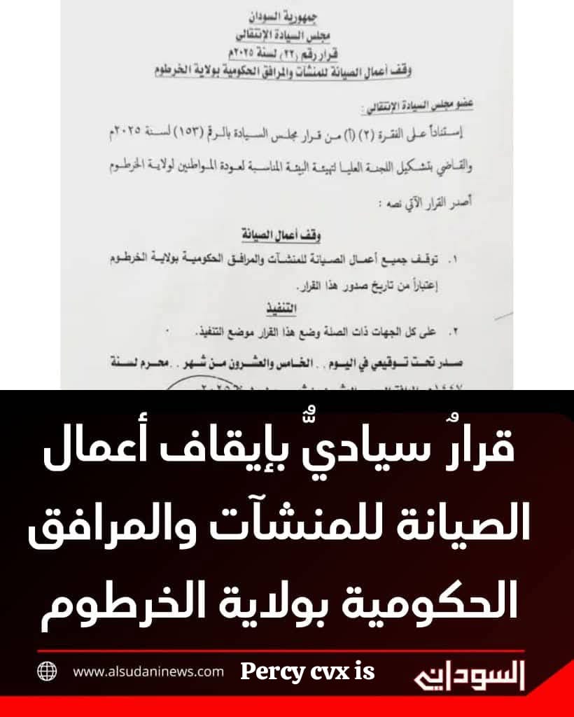 القرار صائب يا ابو الزهراء اعمال الصيانة تحتاج وقت مناسب وقرارت جريئة ولازم تتم عبر دراسة من لجنة يكونها رئيس الوزراء بصفته رئيس الحكومة وبالتأكيد مواد الصيانة سيتم إستيرادها من الخارج لذلك يستوجب طرح اعمال الصيانة في مناقصة لتوفير فرصة لشركات المقاولات أو الأفراد المتخصصين للتنافس الشريف والشفاف مفترض ان تضع الحكومة في اجندة اعمالها هذه الثقافة منذ البداية لتفويت الفرصة على الذين يستغلون هذه الظروف لتحقيق ثروات من المال العام كفاية فساد سنوات الانقاذ والمؤتمر الوطني