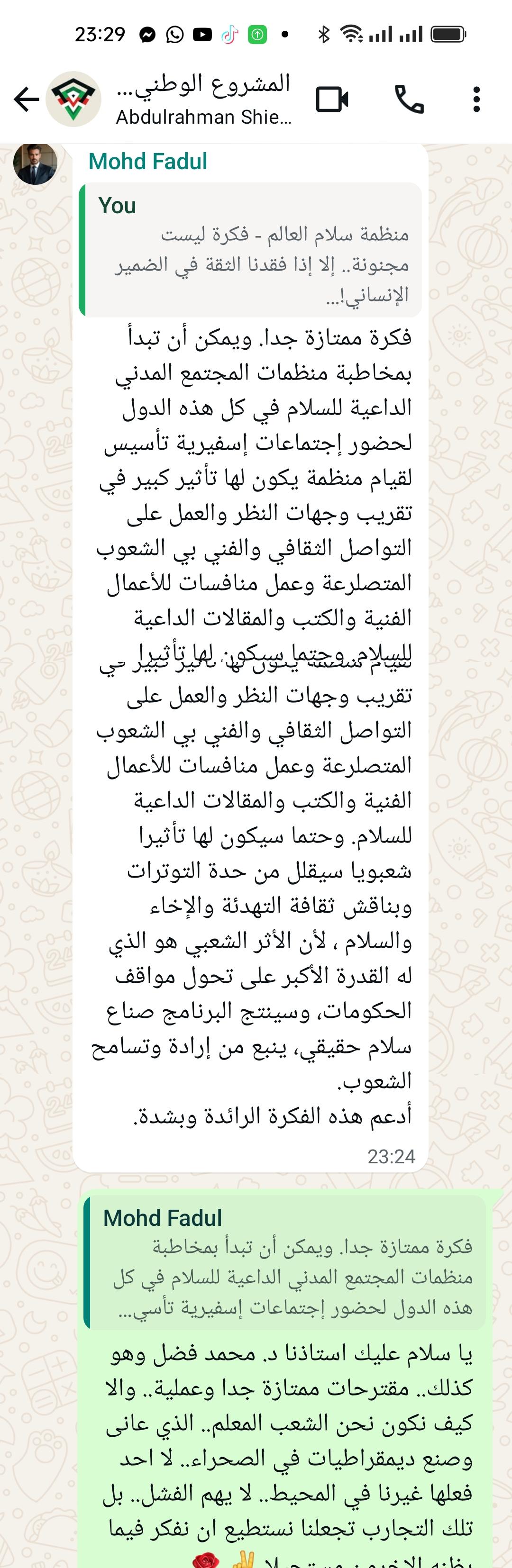 أفكّر منذ زمن طويل في إنشاء بادرة/منظمة تعمل على تفكيك التناقضات والصراعات عبر إشراك الأطراف المتنازعة في تأسيسها، لكن دون حضورهم المادي المباشر، ويقتصر دورهم على المساهمة في تمويلها بمبلغ مئة ألف دولار لكل جهة والا المنظمة نفسها تدفع نيابة عن الجهة التي لا تفي بالطلب الى حين حدوثه.. ومناشط المنظمة تتواصل في كل الاحوال.