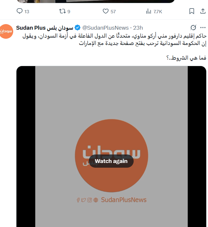 طبعن الفل مُرسال مناوي متواجد في المانيا حيث النقاهة وتارك اهله ياكلون امباز بالفاشر لمهم الضغط جاب الزيت اخونج بورتسودان الان ادركوا ان لا مخرج لديهم الا عن طريق ابوظبي او النفوق الرخيص وقالوا نرسل الفل مرسال يلمح من هنا ومن هناك باننا لا نمانع من فتح صفحة مع الامارات