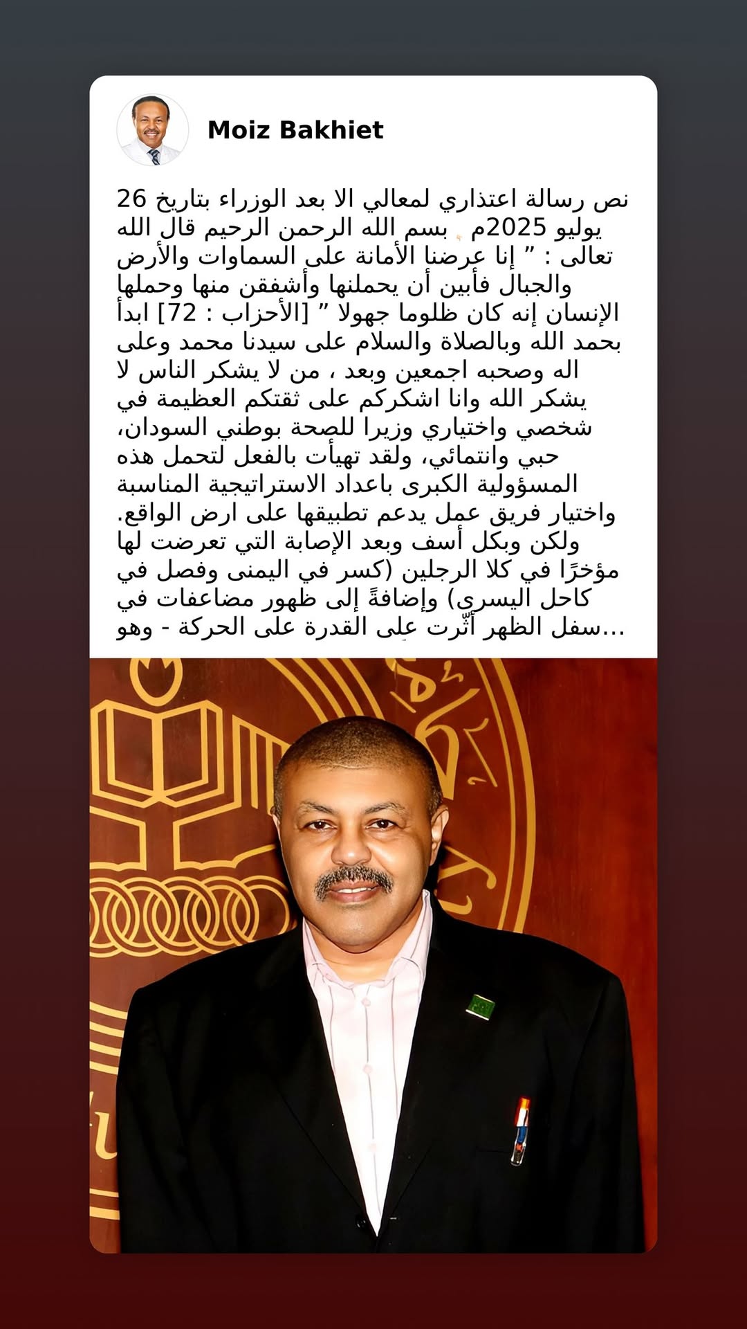أصدر رئيس الوزراء الدكتور كامل ادريس، قرارا اليوم باعفاء الدكتور معز عمر بخيت، من منصبه وزيراً للصحة وتعيين الدكتور هيثم محمد إبراهيم وزيراً لوزارة الصحة .
