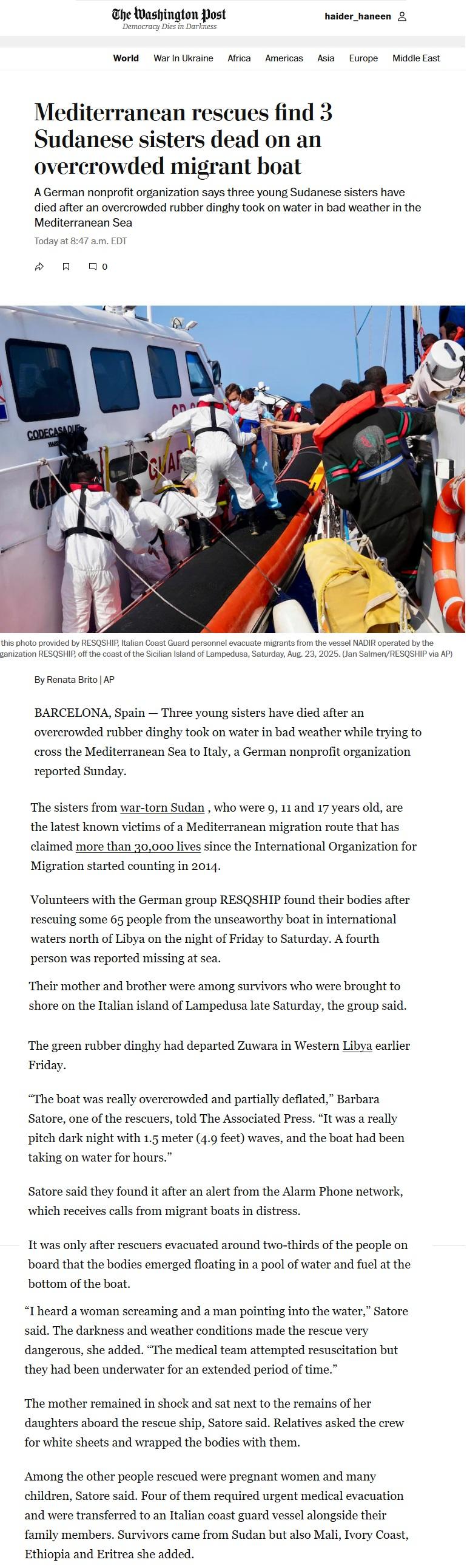 . بحسب ما أوردته صحيفة واشنطن بوست ، عثر عمال الإنقاذ في البحر الأبيض المتوسط على 3 شقيقات سودانيات متوفيات على متن قارب مهاجرين مكتظ تتراوح أعمارهن بين 9 و11 و17 عاماً . لقين حتفهن بعد أن غمرت المياه قارب مطاطي مكتظ وسط سوء الأحوال الجوية في البحر الأبيض المتوسط. وقال عمال الإنقاذ المتطوعون الذين ينتمون لمجموعة RESQSHIP الألمانية إن والدتهم وشقيقهم كانا من بين الناجين ، ونقلهم إلى الشاطئ في جزيرة لامبيدوزا الإيطالية في وقت متأخر من يوم السبت. ونُقلوا إلى سفينة تابعة لخفر السواحل الإيطالي برفقة أفراد عائلاتهم. - شيئ محزن اسأل الله أن يتغمدهن بواسع رحمته ويلهم والدتهن الصبر والسلوان على فقدهن الموجع.