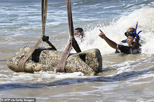 تزيل جرافات المياه والرافعات الهوائية الرمال والطمي التي تغطي القطع الأثرية برفق.