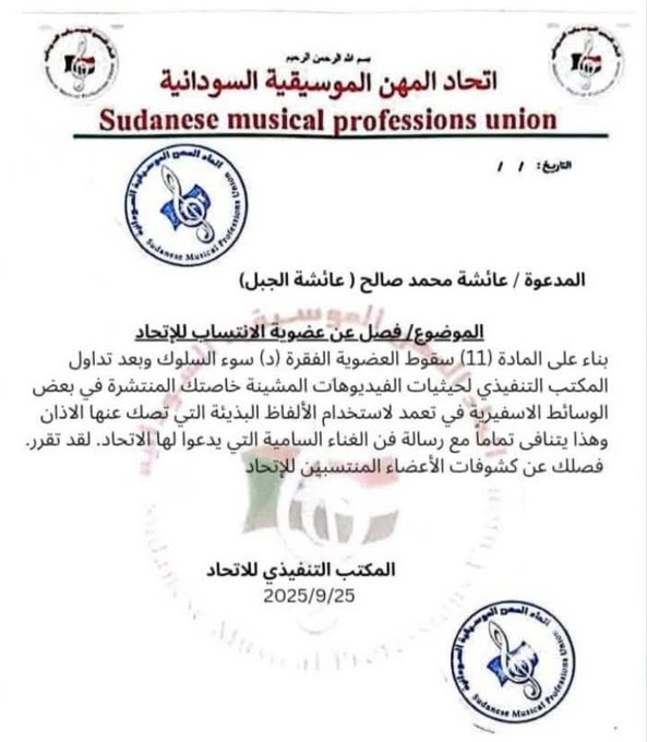 يا حيدروف اتحاد المحن الموسيقية زيو وزي أي قطاع في البلد المنكوبة دي كلو مجاملات وتعاملات بالعاطفة عشان كدا ما مستغرب أبدا يعمل لرندا القلعة وعشة الكامل و هدى جمرة وعواطف بليلة عضوية وعادي ممكن يجيب فاطنة جلكسات يبقيها عميد الفن. العواطف السائلة دي هي الخربت أبو أهل أم أية حاجة في اية حاجة يعنى لما أقول أنو نادية القلعة مجرد قونة لا تعرف حتى معنى الكلمات البترددا في كواريكا يطلع ليك مشجع محترم زي أخوك ياسين الفوق دا يقول ليك اتا ما بتفهم وما حافظ لأنو دي فنانة ليها ضل لأنها وقفت مع الجيش والوطن خخخخخخ طيب شنو يعنى البمنع كونها مجرد قونة ساي ؟؟ هسة قريبي الفارش ليهو خضار في الملجة واقف مع الجيش والوطن فهل دا بخليهو مثلا رائد فضاء ؟؟؟