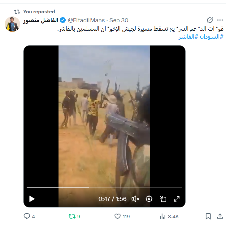 انت يابريمة الأشاوس عندهم احدث الجوالات التي نهبوها خلال السنتين الفاتت، معقولة مافيهم شفششافي قادر يرسل مقاطع فيديو من داخل الفاشر وثبت صحة الفيديو! معقولة للدرجة دي أفلستم في الحقائق والمنطق.. ومصرين على هذه الغوغائية! .. وقديما قيل: من لم يرمي الحطب طوعا ويكسر كيره، يظل أبد الدهر مجنترا زي سيده بعاتيه.