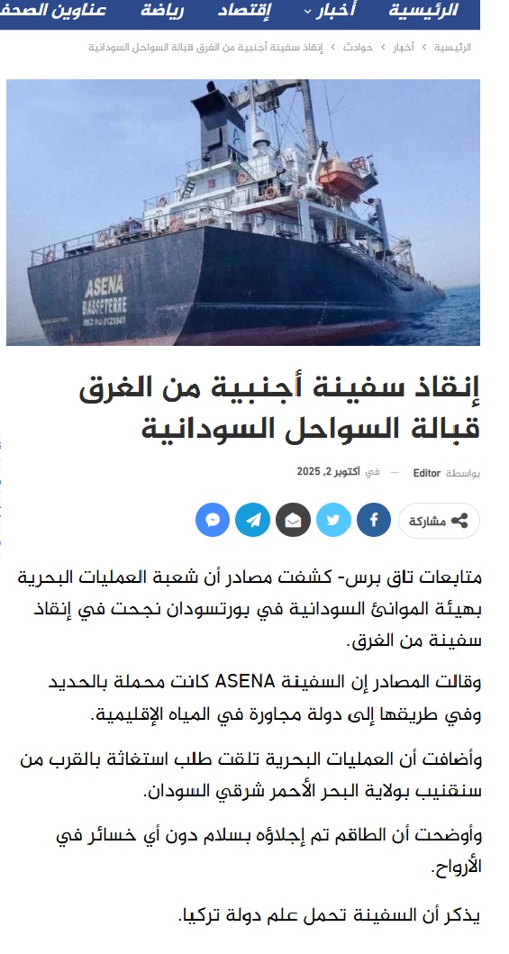 عزه ايره @Azaa_aira · 45m غرق باخرة الشحن (Cargo) قبالة السواحل السودانية بعد تعرضها لحادث قرب منطقة سنقنيب ، وفرق العمليات البحرية التابعة للموانئ السودانية تنقذ طاقمها .