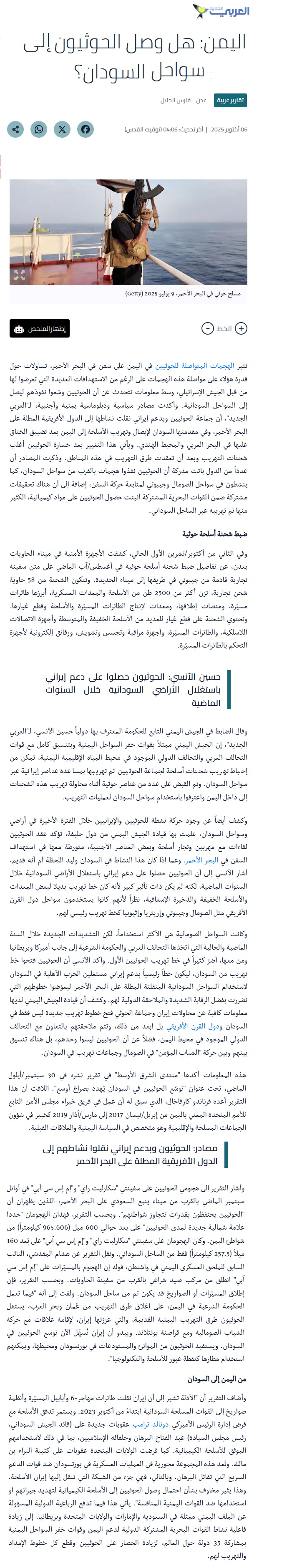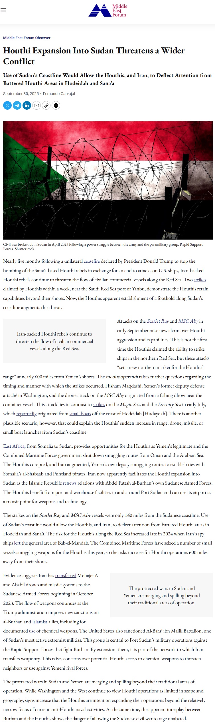 Quote: هذه المعلومات أكدها "منتدى الشرق الأوسط" في تقرير نشره في 30 سبتمبر/أيلول الماضي، تحت عنوان "تحت عنوان "توسّع الحوثيين في السودان يُهدد بصراع أوسع.".