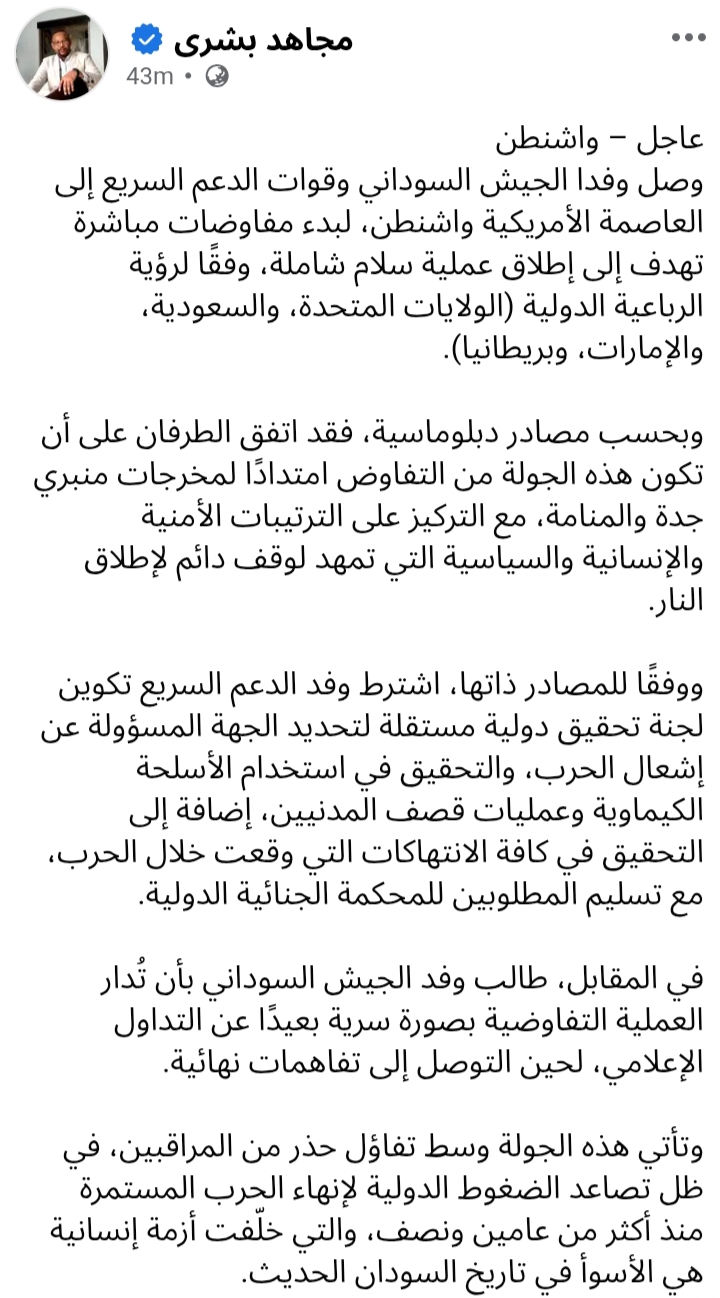 الرباعية تكشر أسنانها وتفرض علي موفدي برهان وحميدتي التوقيع (اليوم الجمعة ) علي هدنة لوقف اطلاق النار وفتح الممرات الانسانية بلا شروط أو قيود 🛑 عبدالرحمن الامين (موجز للقروب الخاص ) عصر الخميس 23 أكتوبر 2025 واشنطن أولاً ، يتعين القول ان جلسات المفاوضات بين مجموعة الرباعية ووفدي الجيش والدعم السريع تجري وسط تكتم غير مسبوق وسرية شديدة. هذا التعتيم الاخباري اصبح اسلوبا ومنهجاً تتبناه كافة الوزارات في ادارة الرئيس ترمب وبخاصة عند تناولها للملفات الدولية وحرصها علي إبعاد " الصفقات " عن عيون الاعلام . ثانياً ، يزيد من تعقيد الموقف وغموضه تعطل الدواوين الحكومية الفيدرالية وتوقفها عن تصريف مهامها العادية بسبب النزاع العنيف بين نواب الحزبين الديموقراطي والجمهوري علي اجازة الميزانية الفيدرالية مما عني توقف الدولة عن صرف المرتبات ودخول العاملين في القطاع الحكومي في اجازة مفتوحة !! اتصلت صباح اليوم الخميس بمصدر رفيع في الخارجية الامريكية ظللت اتعامل معه لعدة سنوات ويعتبر مرجعاً مهنياً في الشؤون الأفريقية . المفاجأة الاولي " خاصة " اذ ابلغني انه ترك العمل في وزارة الخارجية بعد ان شمله كشف الإحالات القسرية التي تم تنفيذها بواسطة ادارة ترمب في منتصف الصيف . ووعد بسؤال من يعرف والعودة لي ببعض المعلومات . عاود الاتصال بي قبل قليل وأبلغني ان وفد برهان وحميدتي سوف يوقعان غداً هدنة وقف إطلاق نار لمدة 3 أشهر وسوف يتعهدان بفتح جميع الممرات الإنسانية في كل المناطق الواقعة تحت سيطرتهما دون قيد أو شرط . قال ان هذا الاتفاق قُدم لهما جاهزا وتم الطلب منهما التوقيع عليه كما هو ، دون اي اي تعديل بالحذف او الإضافة أو حتي مجرد تغيير نص الجملة . في تقديره ان الوفدان يعلمان انهما "ينفذان أوامر " دولية تنطق به شفاة أمريكية . قال ان هذه الجولة سوف تمر بدون مفاجآت وبخاصة ان الوفدين لم يحضرا لواشنطن لمباحثات وانما في رحلة ( لتنفيذ المطلوبات ) They are here to execute orders -كما قالها بالإنجليزية- وهذا ما سيحدث |