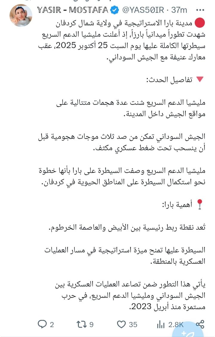 Quote: مصدر الخبر / السودان نيوز في بيان صدر صباح السبت، أفادت قوات الدعم السريع بأنها تمكنت من استعادة السيطرة مرة أخرى على مدينة بارا الواقعة في ولاية شمال كردفان، وذلك بعد فترة من التوترات العسكرية التي شهدتها المنطقة. وأكدت القوات أن هذا التحرك يأتي في إطار عملياتها الميدانية المستمرة، مشيرة إلى أن استعادة بارا تمثل خطوة جديدة في مسار إعادة الانتشار العسكري داخل الولاية. ويُعد هذا الإعلان تأكيداً على استمرار المواجهات بين الأطراف المتنازعة في مناطق متفرقة من السودان، وسط تصاعد في وتيرة العمليات العسكرية التي تشهدها ولايات غرب ووسط البلاد.