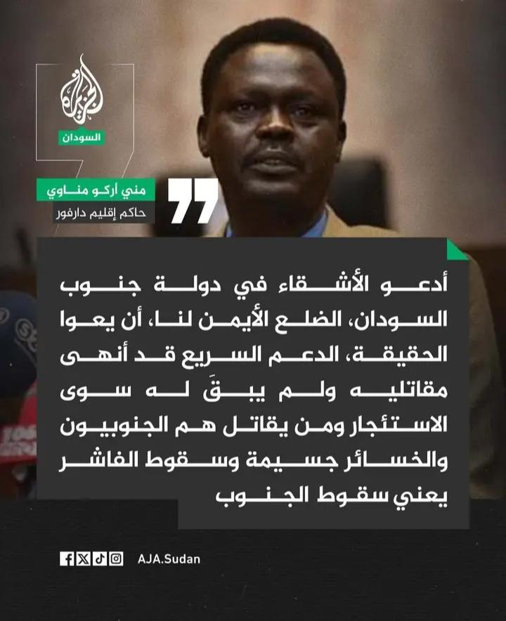 يا حيدر الموضوع منتهي خالص شتايم المشتركة جنود وضباط ضد الجيش لا توصف وغير صالحة للنشر، اما الفلنقاي مناوي ما عندو غير يمشي المانيا حيث تقيم زوجته، لا الجنوب فاضي ليهو ولا الشمال ولا الشرق ولا الغرب.