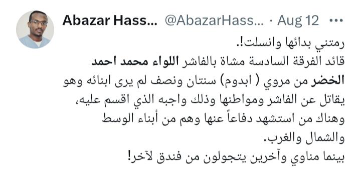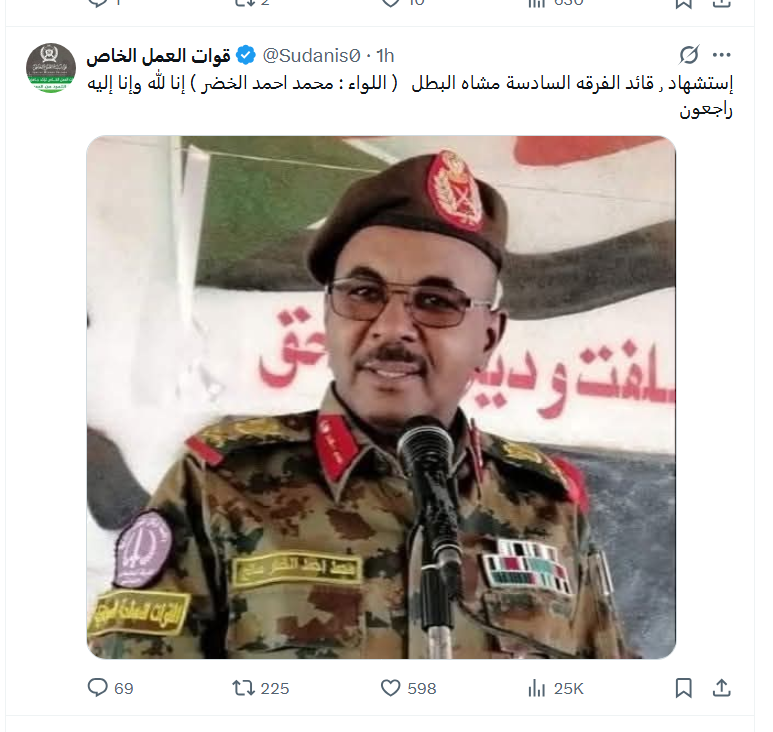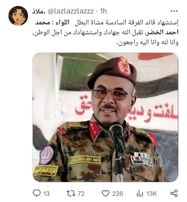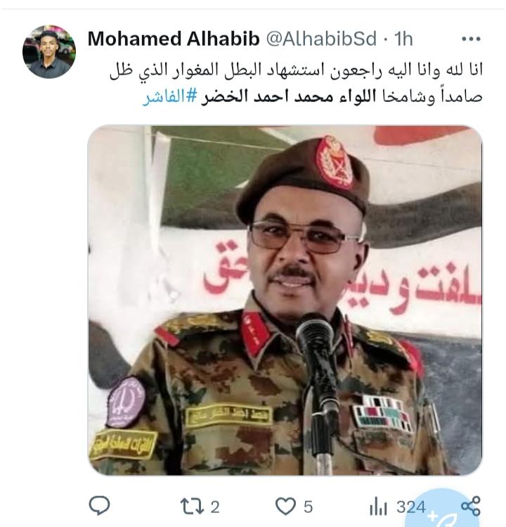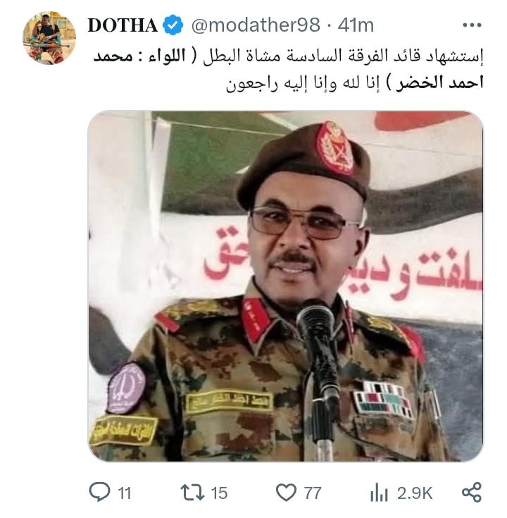 سيكتب التاريخ ان اللواء خضر قاتل حتي اللحظات الاخيرة من حياته في سبيل ما يؤمن به في الوقت الذي هرول وهرب وعرررررررررررررررررررررررررررررررررد عشرات اللواءات من جيش سوسو الي اسطنبول وجزر اللانيا ومرميس وانطاليا وفتحية وجزر البسفور السبعة يتبطحون علي شواطئها هم ونسائهم كان ممكن عادي اللواء الخضر -ان صح خبر مقتله- كان ممكن عادي ان يفحط الي حي الرحاب الفاخر بالقاهرة ويستاجر شقة كبيرة له ولعياله علي حساب مال الشعب كما فعل غيره من الضباط ويدخن شيشة في المقاهي وياكل ما لذ ما طاب كما يفعل عشرات ومئات اللواءات من جيش سوسو او يهرب ويقدموا لجوء في اوروبا كما فعل الكثير من ضباط جيش سوسو ويسدو دي بطينة ودي بعجينة ويدخلوا السوشيال ميديا باسماء نسائية مستعارة لكن الرجل صمد وصندد حتي اتاه اليقين.رحمه الله.
