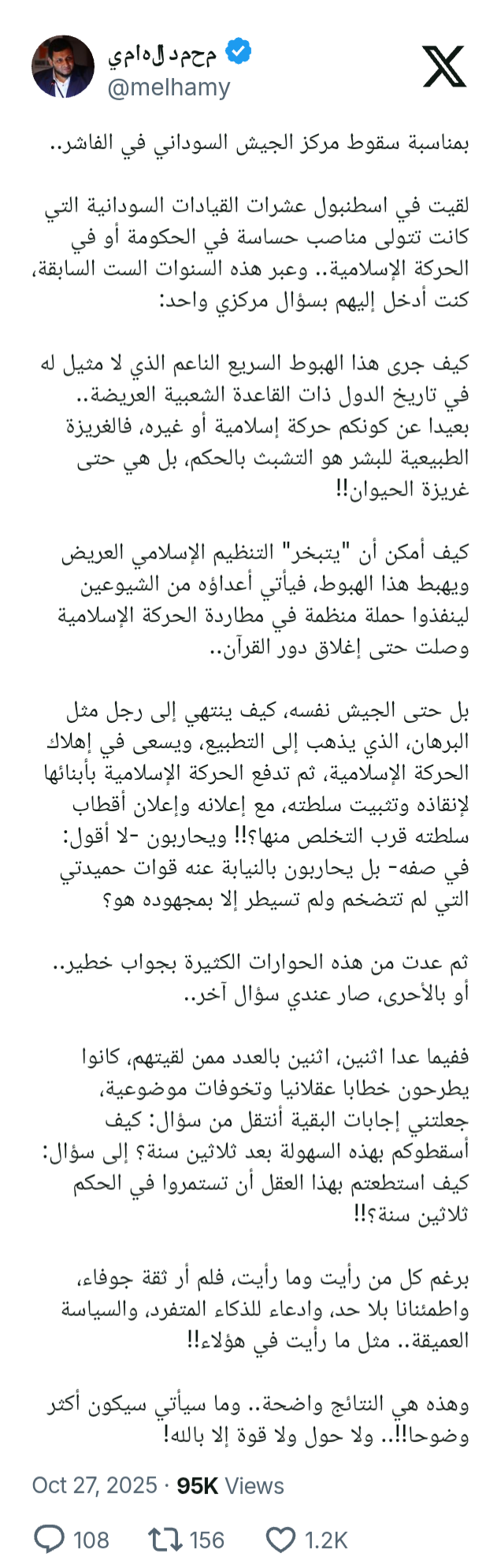 عشرات القيادات الهاربين الذين إلتقيت بهم في ملاذهم الآمن في تركيا هم سبب الدمار الذي يجري في بلادنا ألم تسأل نفسك.. كيف نظام يحكم ٣٠ سنة وتتشرد قياداته بالشكل الذي رأيته بعينك ؟