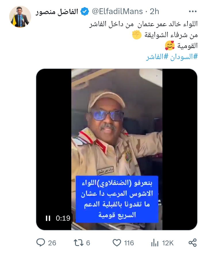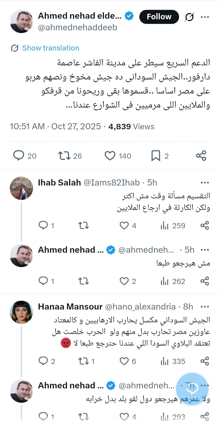 رد فعل حسابات بعض المصريين في تويتر على سقوط الفاشر .. مسخرة على الجيش
